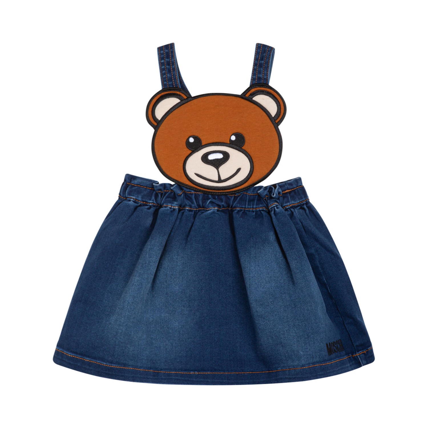 Moschino Kids Teddy Bear Denim Skirt. Light pink and indigo blue cotton blend set of two. T-Shirt: embroidered logo to the front, crew neck, rear press stud fastening, short puff sleeves, straight hem. Skirt: signature Teddy Bear motif, embroidered logo to the side, rear criss cross straps, elasticated waistband, flared skirt, staright hem, unlined.
