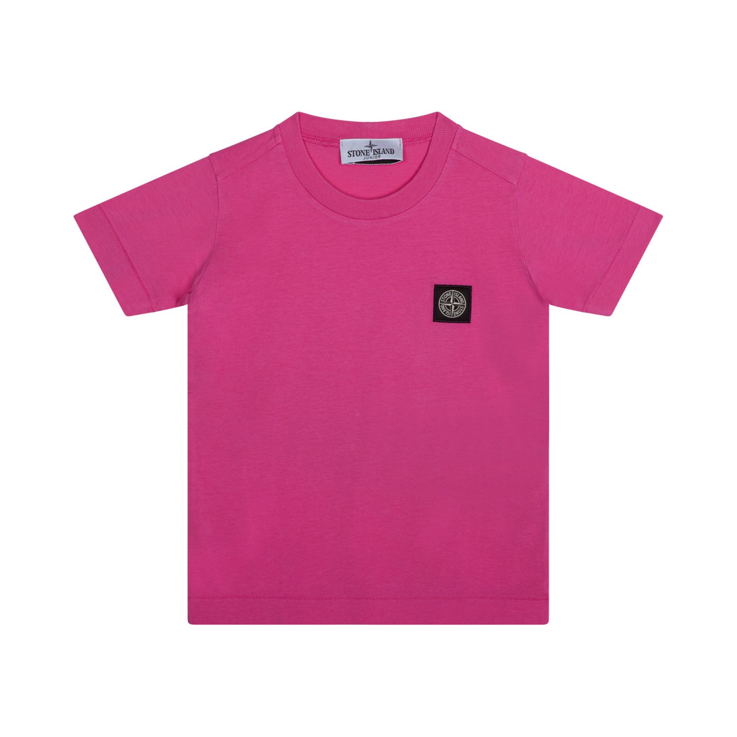 Stone Island Kids Fuchsia T-Shirt. Fuchsia cotton t-shirt with short sleeves, ribbed crew neck and outer seams. It is decorated with a logo on the front.