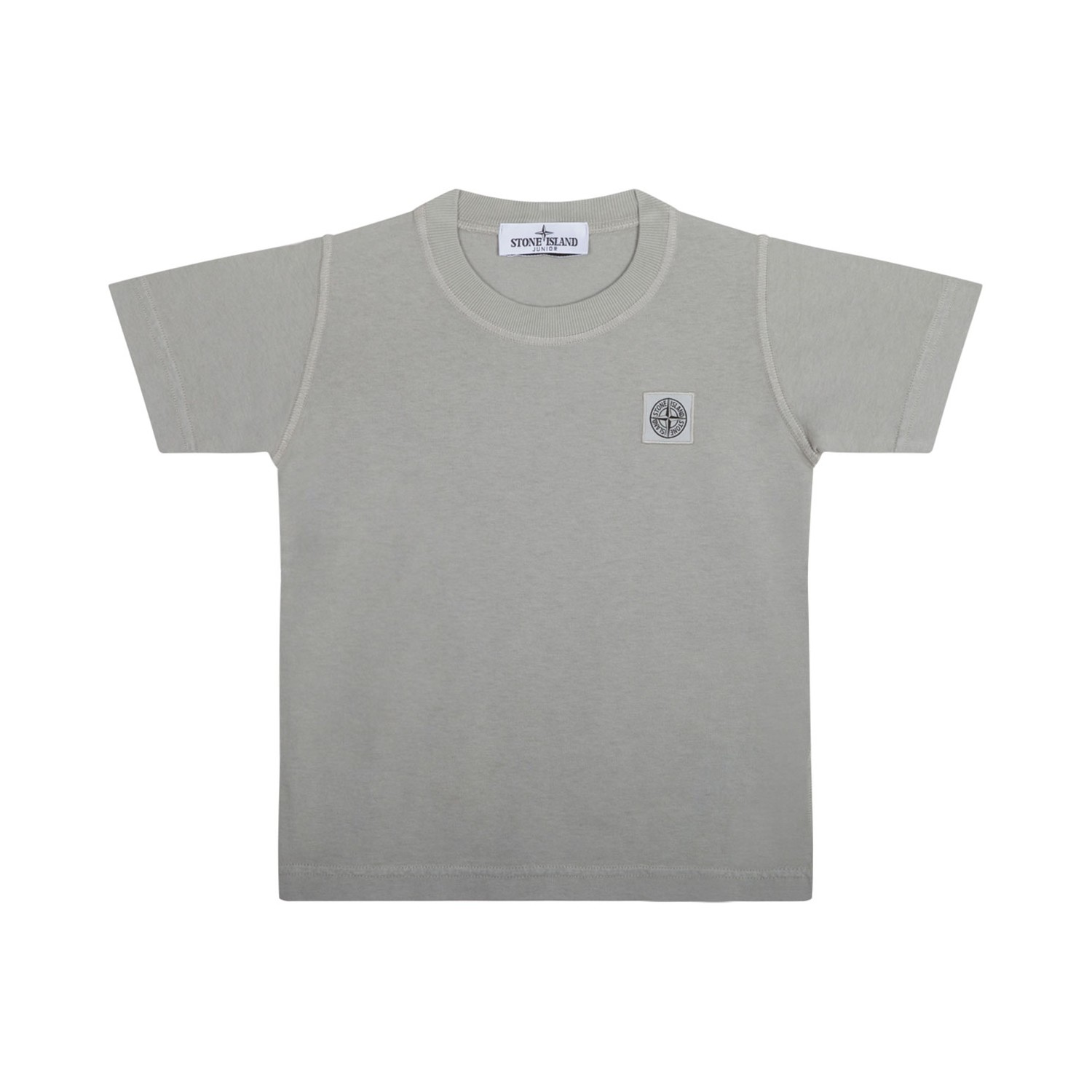 Stone Island Pearl Grey T-Shirt. Pearl grey cotton with short sleeves, ribbed crew neck and outer seams. It is decorated with a logo on the front.