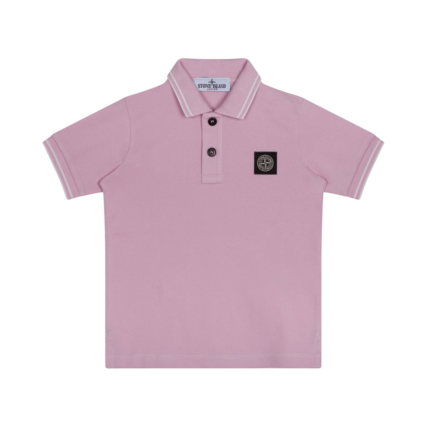 Stone Island Junior Pink Polo Shirt. Pink half sleeve polo shirt, two buttons on front, contrasting piping on collar and sleeves, iconic logo applied on front.