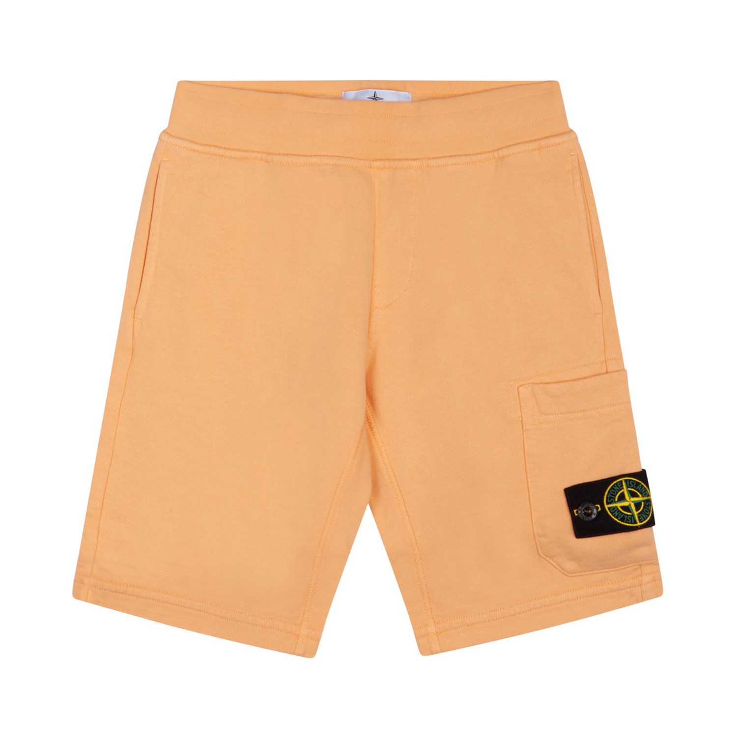 Stone Island Junior Light Orange Shorts. Cotton shorts, elasticated waistband, two side slit pockets, side cargo pocket with signature detachable Compass badge. Rear welt pocket