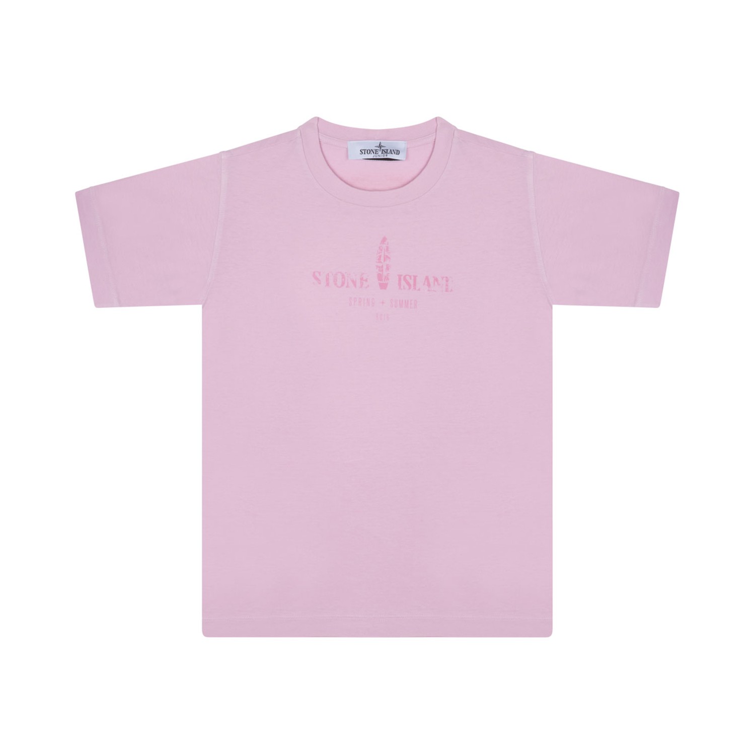 Stone Island Junior Pink Logo Print T-Shirt. Logo print to the front and rear, crew neck, short sleeves, straight hem.