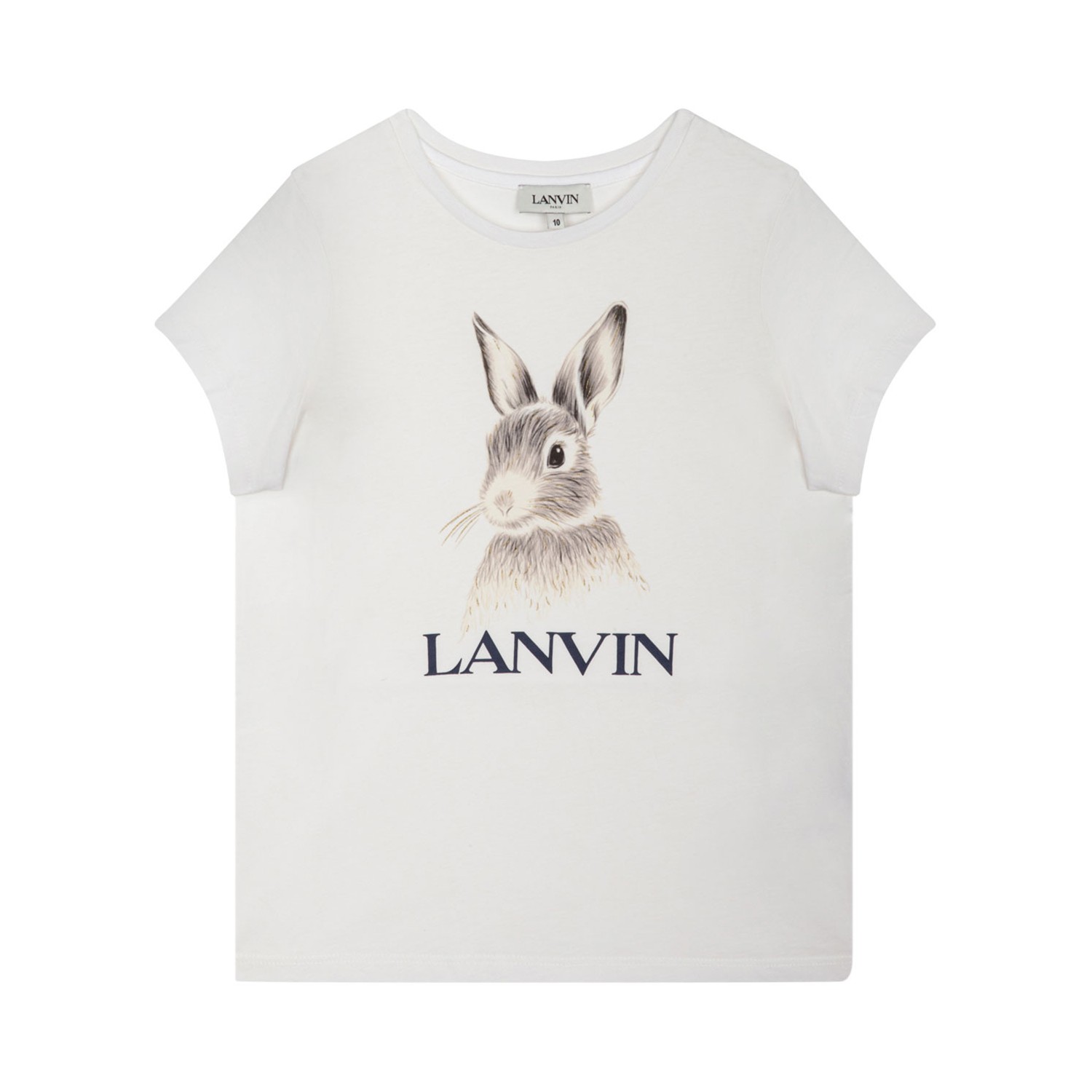 Lanvin Kids Botanica Rubbit Print T-Shirt. White cotton t-shirt, jersey texture, illustration style print. Logo print to the front, round neck, short sleeves, straight hem.