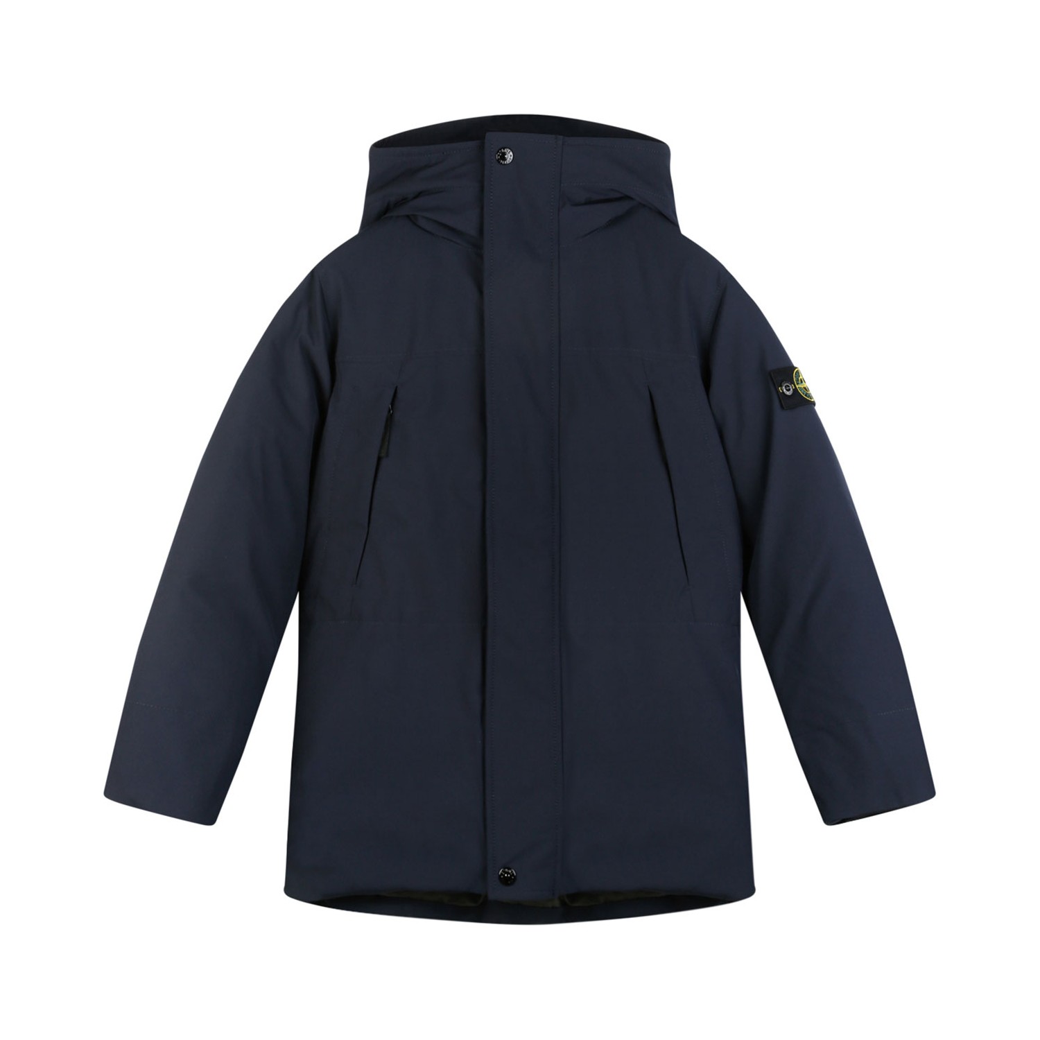 Stone Island Junior Navy Blue Parka. Navy blue padded design parka, signature detachable Compass badge, classic hood, high neck. Concealed front zip fastening, long sleeves, front zip fastening pockets and straight hem.
