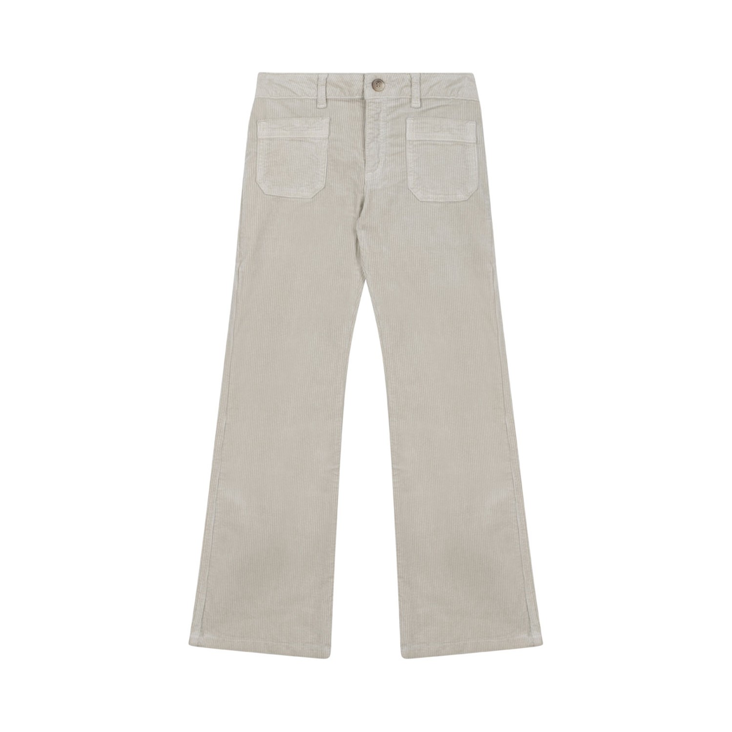 Bonpoint Junon Flared Trousers. Beige organic cotton blend trousers, corduroy, belt loops. Concealed fly and button fastening, two front patch pockets, two rear patch pockets and flared.