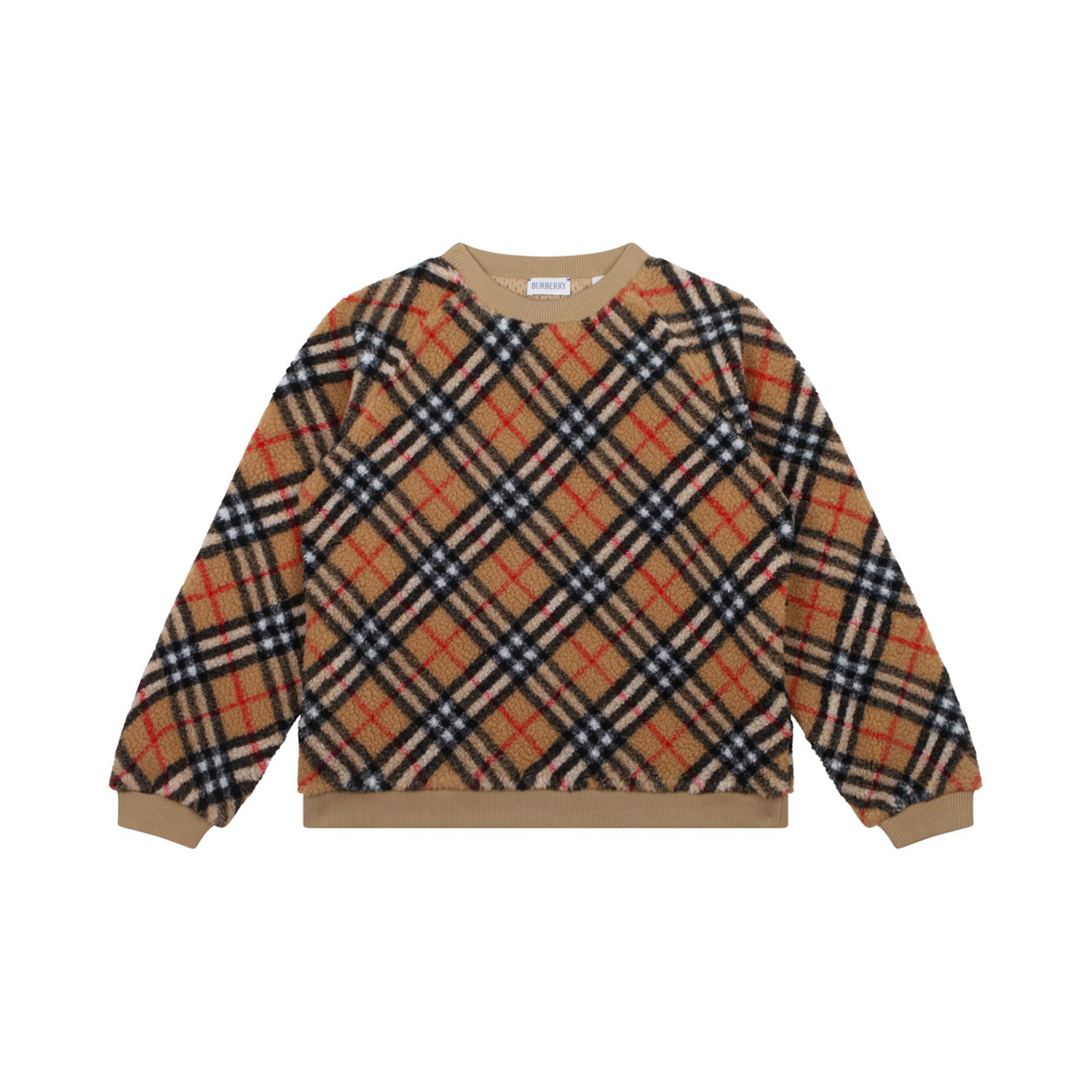 Burberry Kids Archive Beige Pullover. Crew neck pullover in textured fleece with woven Burberry Check motif. Ribbed collar, cuffs and hem, mesh lining.