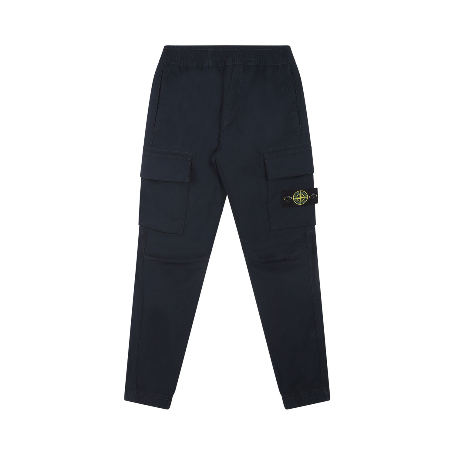 Stone Island Junior Navy Blue Track Pants. Black cotton blend track pants, jersey texture, signature detachable Compass badge. Elasticated waistband, two side slit pockets, two side cargo pockets, tapered leg, elasticated ankles.