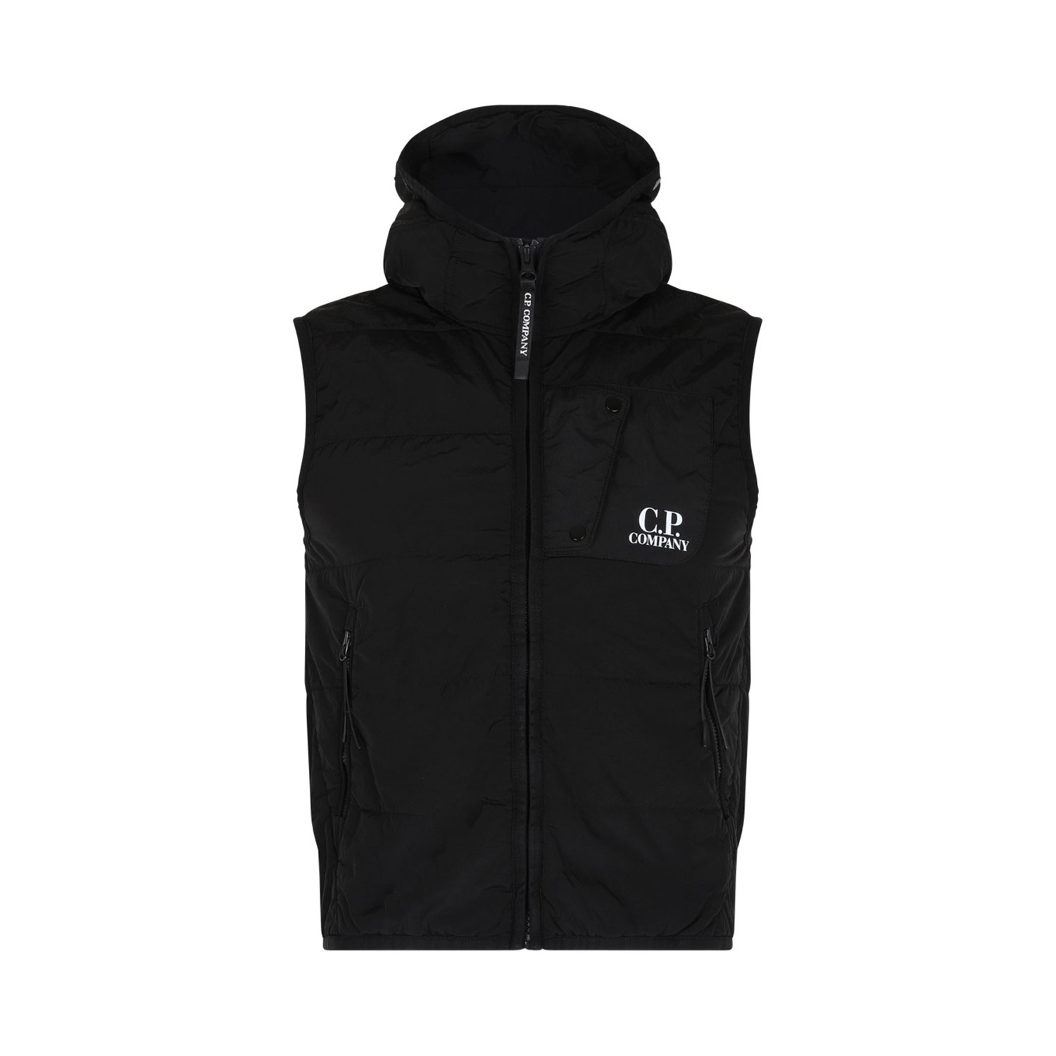 C.P. Company Kids Black Padded Gilet. Black padded gilet, hooded, full zip, side pocket with zip, logo patch on heart.