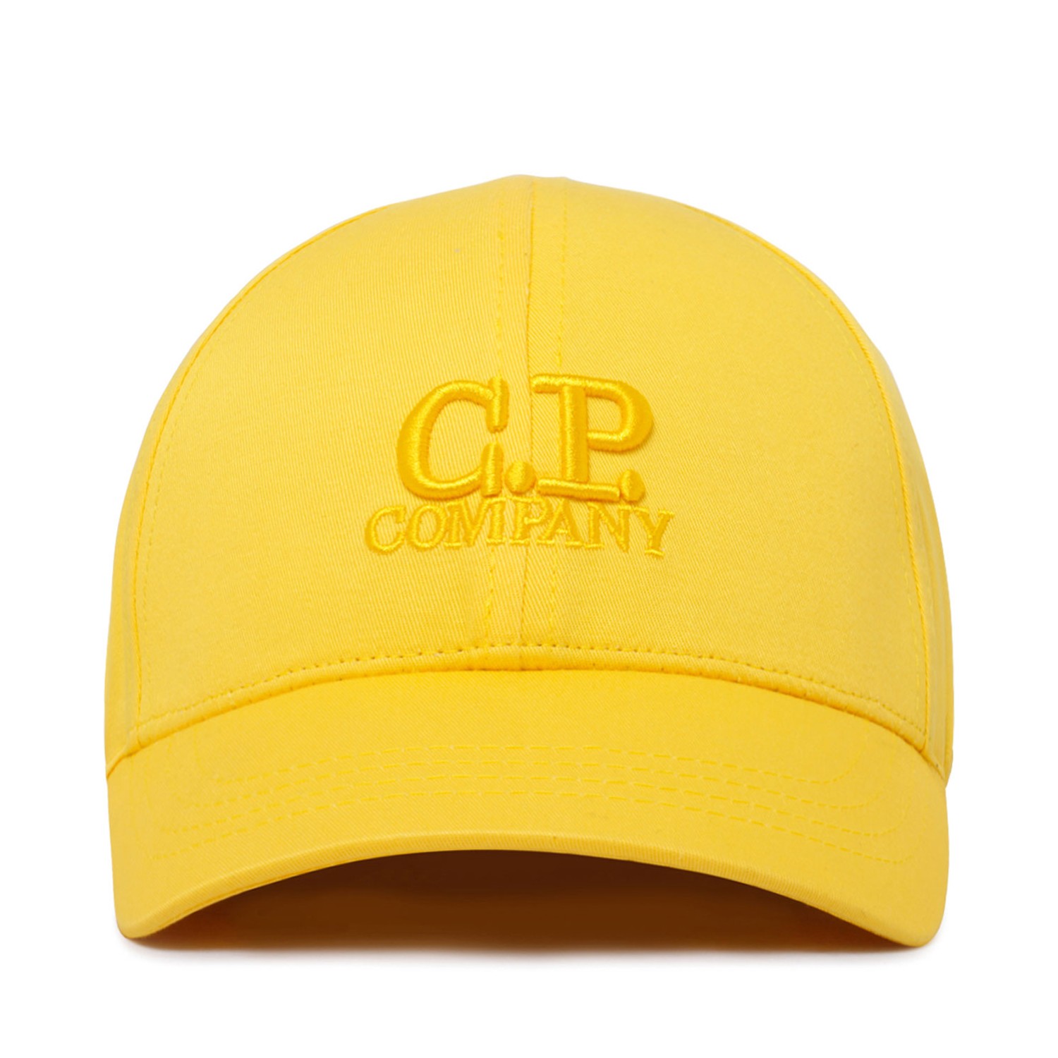 C.P. Company Kids Yellow Cap. Yellow cotton cap, six panel construction, oval crown, embroidered logo to the front. Curved peak and adjustable strap to the rear.