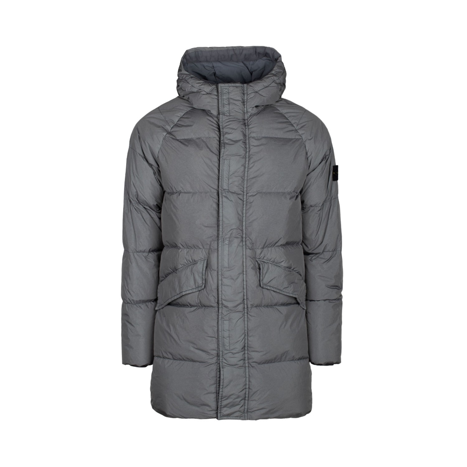 Stone Island Junior Grey Padded Jacket. Grey feather down jacket, padded design, signature detachable Compass badge, tonal stitching, classic hood, concealed front zip fastening, long sleeves, two front flap pockets and straight hem.