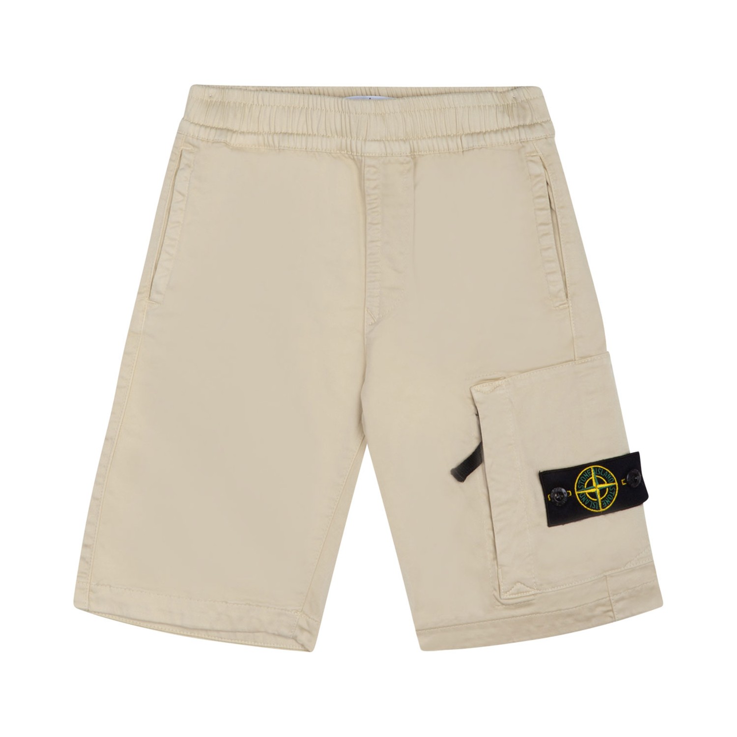 Stone Island Junior Beige Cotton Blend Cargo Style Shorts, two side pockets, front zipper pocket, back welt pocket. Elasticated waistband with inner drawstring.
