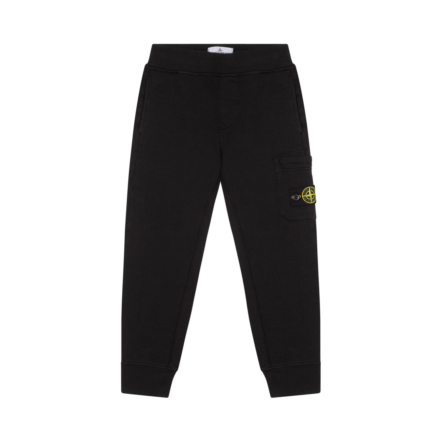 Stone Island Junior Black Logo Patch Trousers. Black cotton trousers, elasticated waistband, two side inset pockets, detachable compass badge. Rear welt pocket and elasticated cuffs.