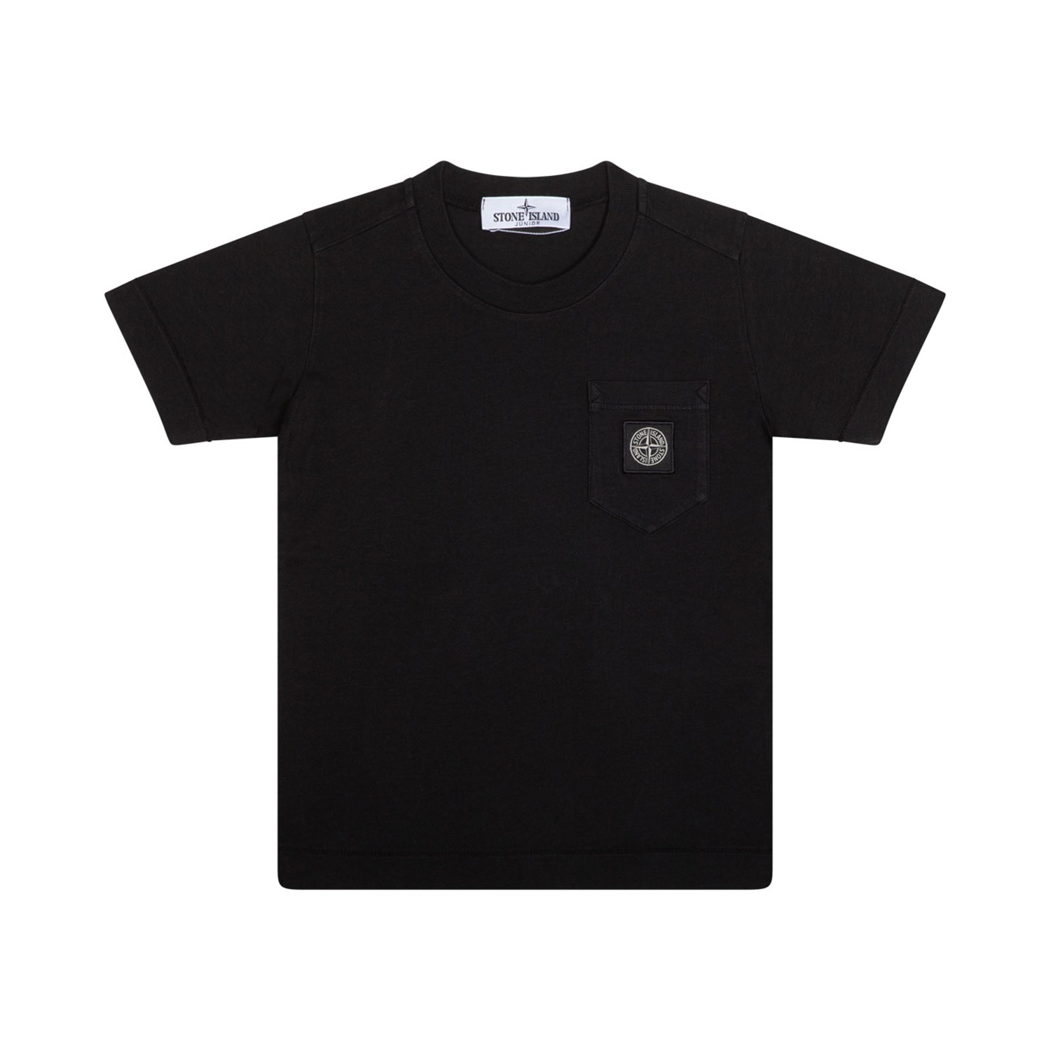 Stone Island Junior Black T-Shirt. Black cotton t-shirt, logo patch to the front, crew neck, short sleeves.