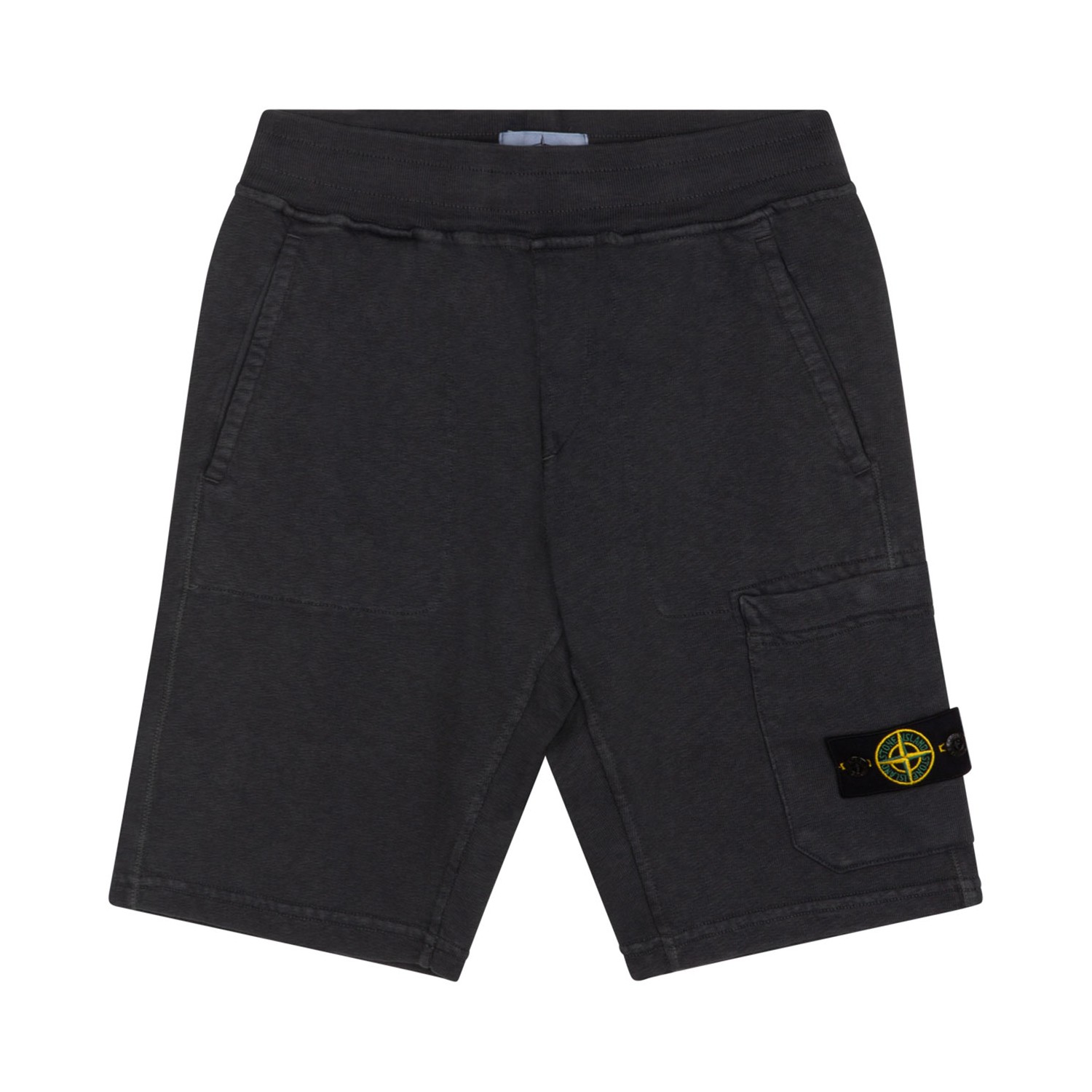 Stone Island Junior Blue Grey Compass Patch Track Shorts. Elasticated drawstring waistband, two diagonal pockets to the sides, side patch pocket. Detachable Compass patch, rear welt pocket, French terry lining.
