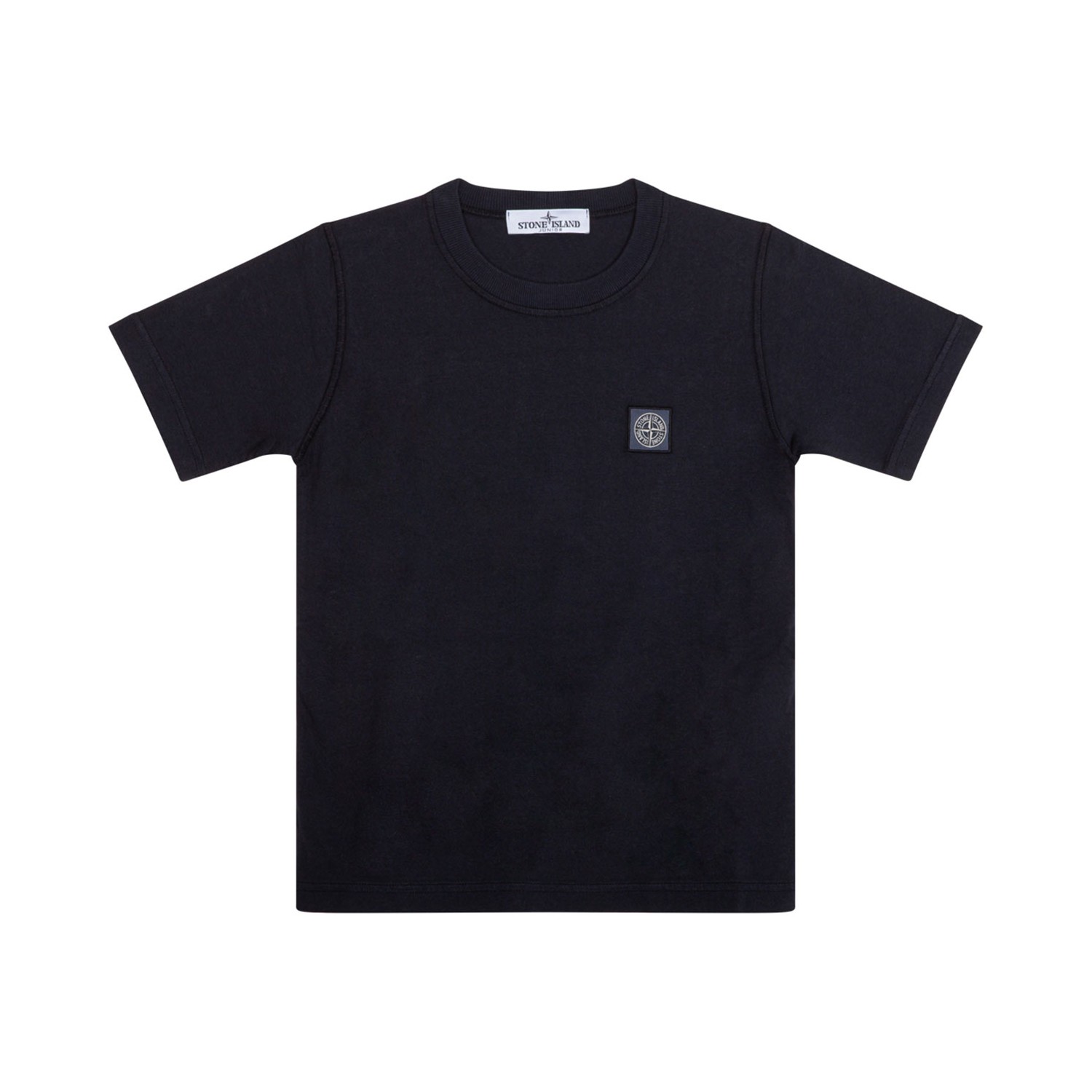 Stone Island Navy Blue Cotton T-Shirt. Navy blue cotton t-shirt with short sleeves, ribbed crew neck and outer seams. It is decorated with a logo on the front.
