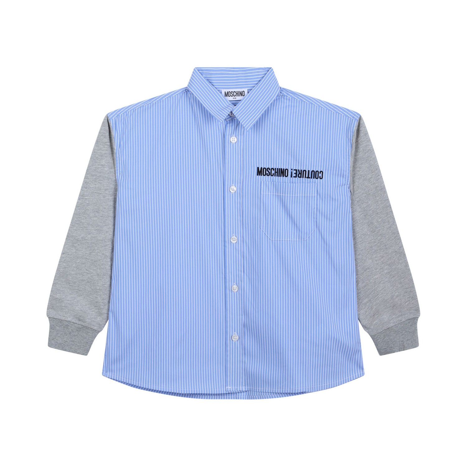 Moschino Kids Striped Shirt. Blue cotton blend shirt, long sleeves, ribbed cuffs, front button fastening, embroidered logo at the chest.