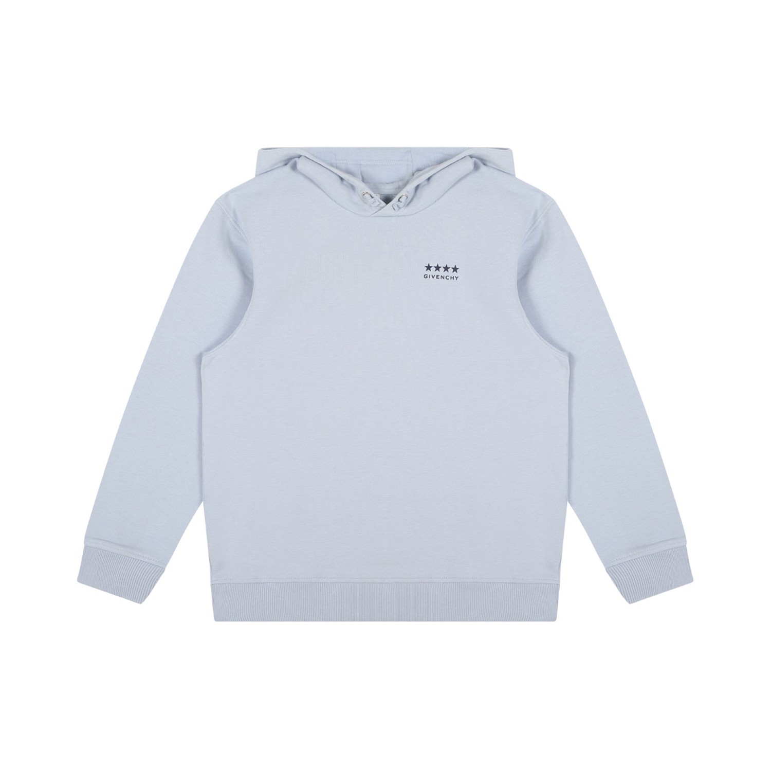 Givenchy Pale Blue Hooded Sweatshirt. Pale blue jersey hooded sweatshirt with long sleeves. Ribbed hem and cuffs. Logo print on chest and 4G logo on back. Straight hem.