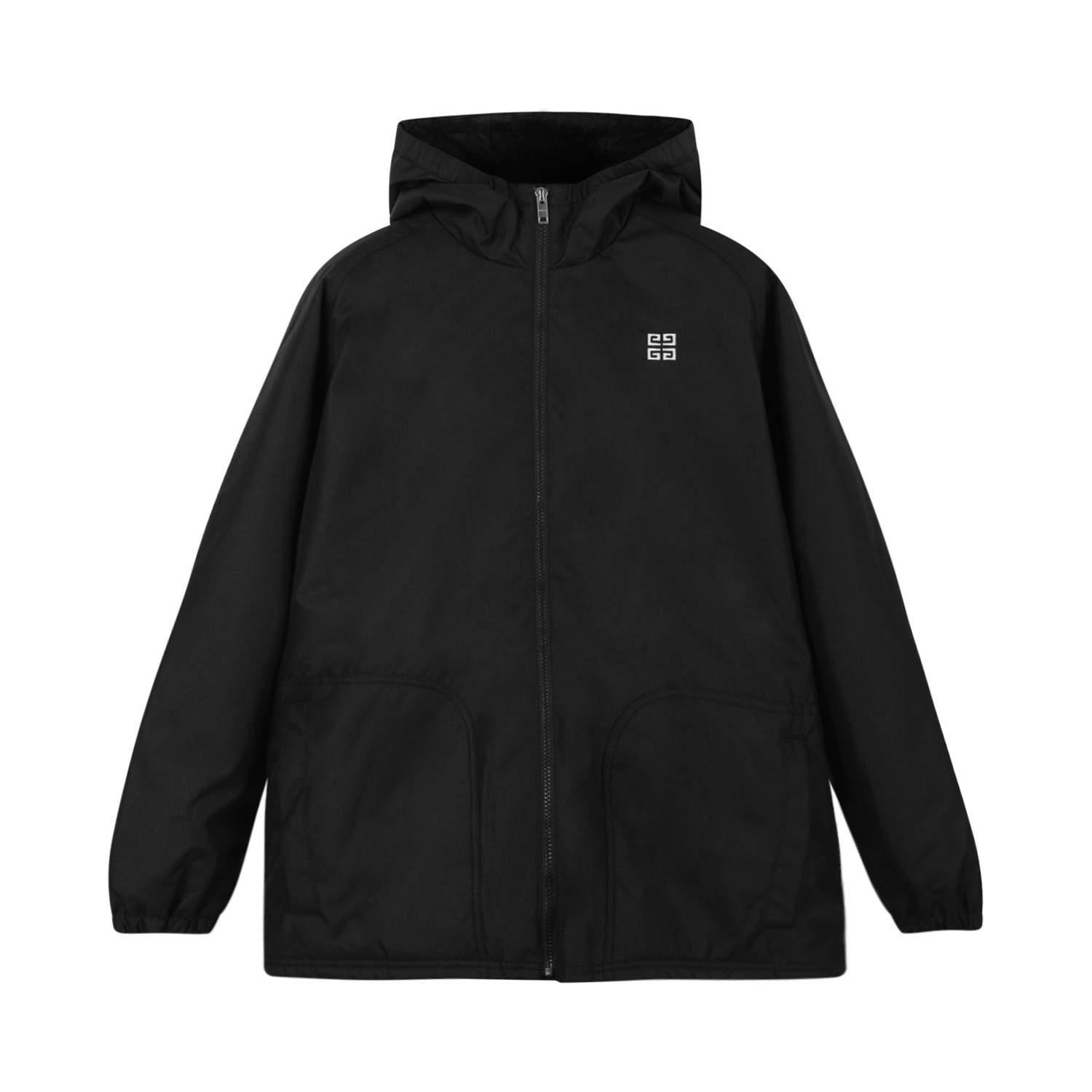 Givenchy Kids Black Logo Embroidered Coat. Black hooded coat, embroidered logo to the rear, embroidered logo at the chest. Two side inset pockets, front zip fastening, fitted cuff sleeves, straight hem.