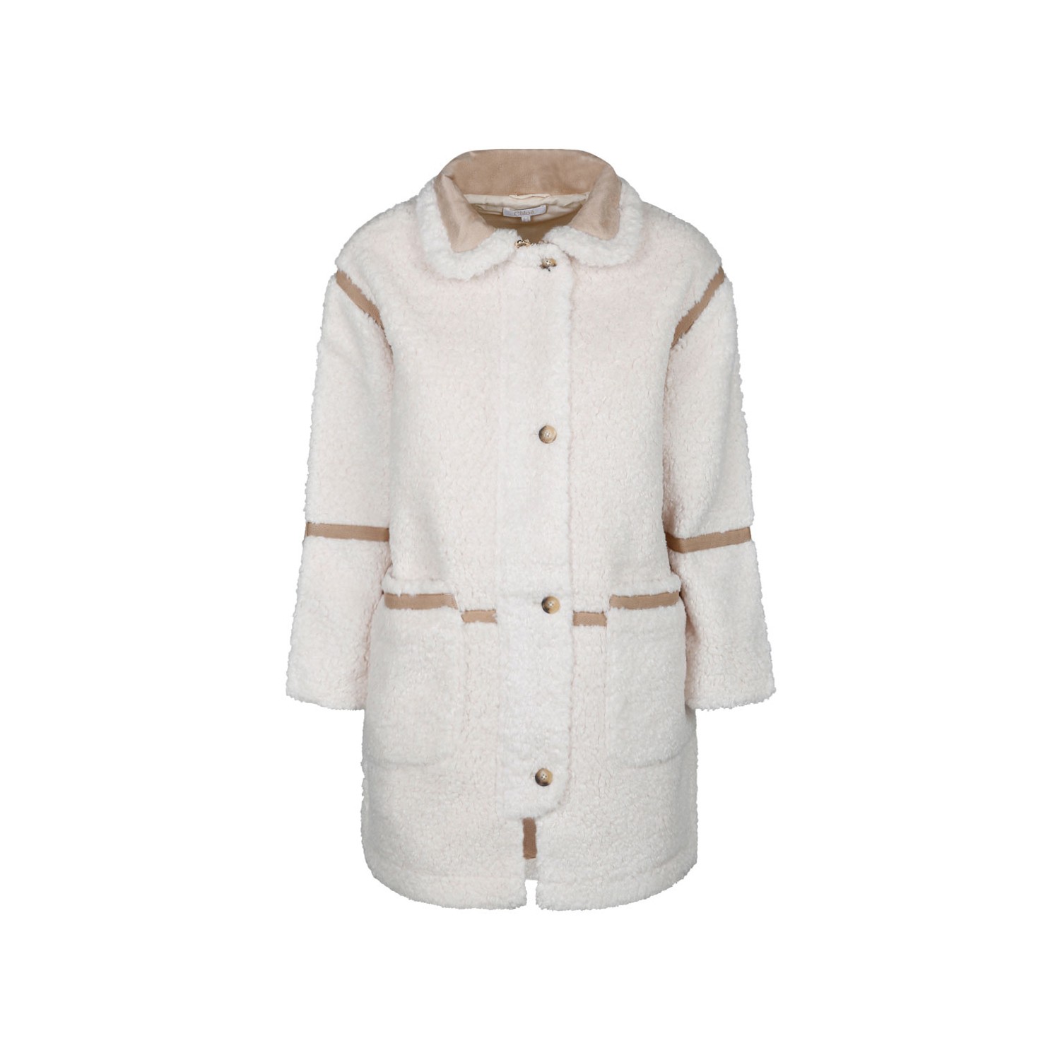 Chloe Kids Cream White and Beige Faux Shearling Coat. Cream white and beige faux shearling coat, Peter Pan collar, front button and zip fastening, stripe detailing, two front patch pockets, long sleeves and curved hem.