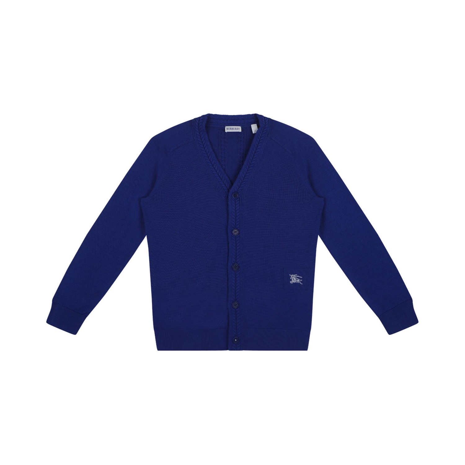 Burberry Royal Blue EKD Embroidered Cardigan. Royal blue wool cardigan, cable knit trim, signature. Equestrian Knight motif, V-neck, front button fastening, long sleeves, ribbed cuffs and hem.