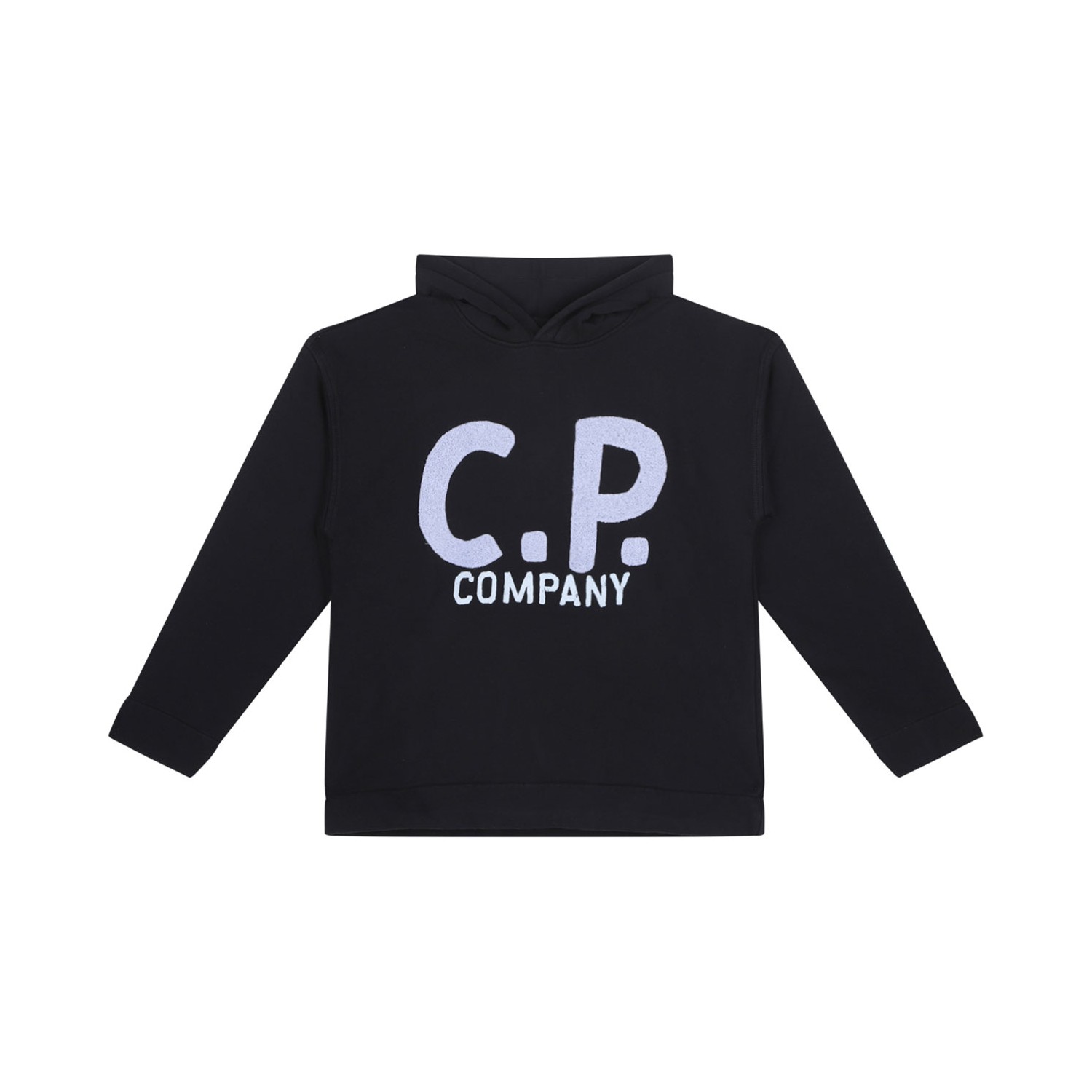 C.P. Company Black Sweatshirt. Black cotton sweatshirt, hooded, logo print to the front, long sleeves.