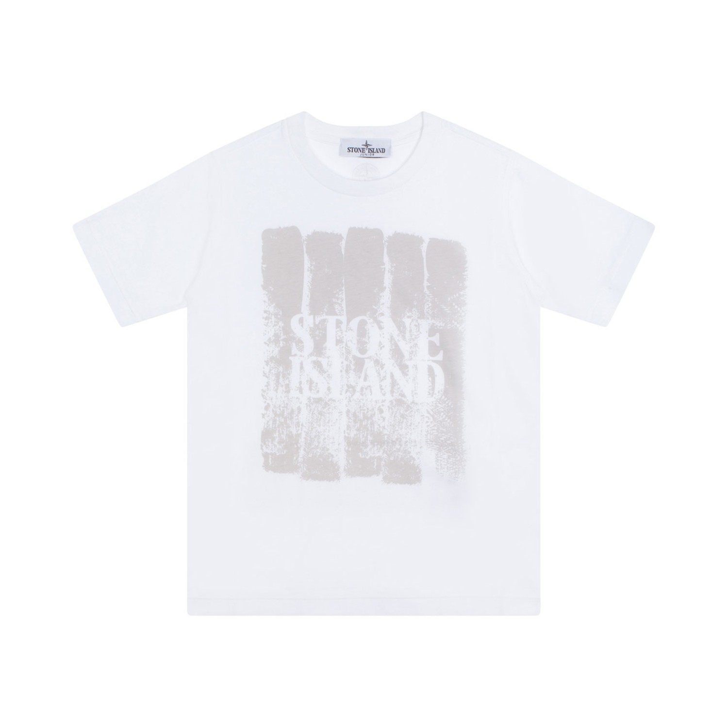 Stone Island Junior White Logo Print T-Shirt. Logo print to the front and rear, crew neck, short sleeves, straight hem.