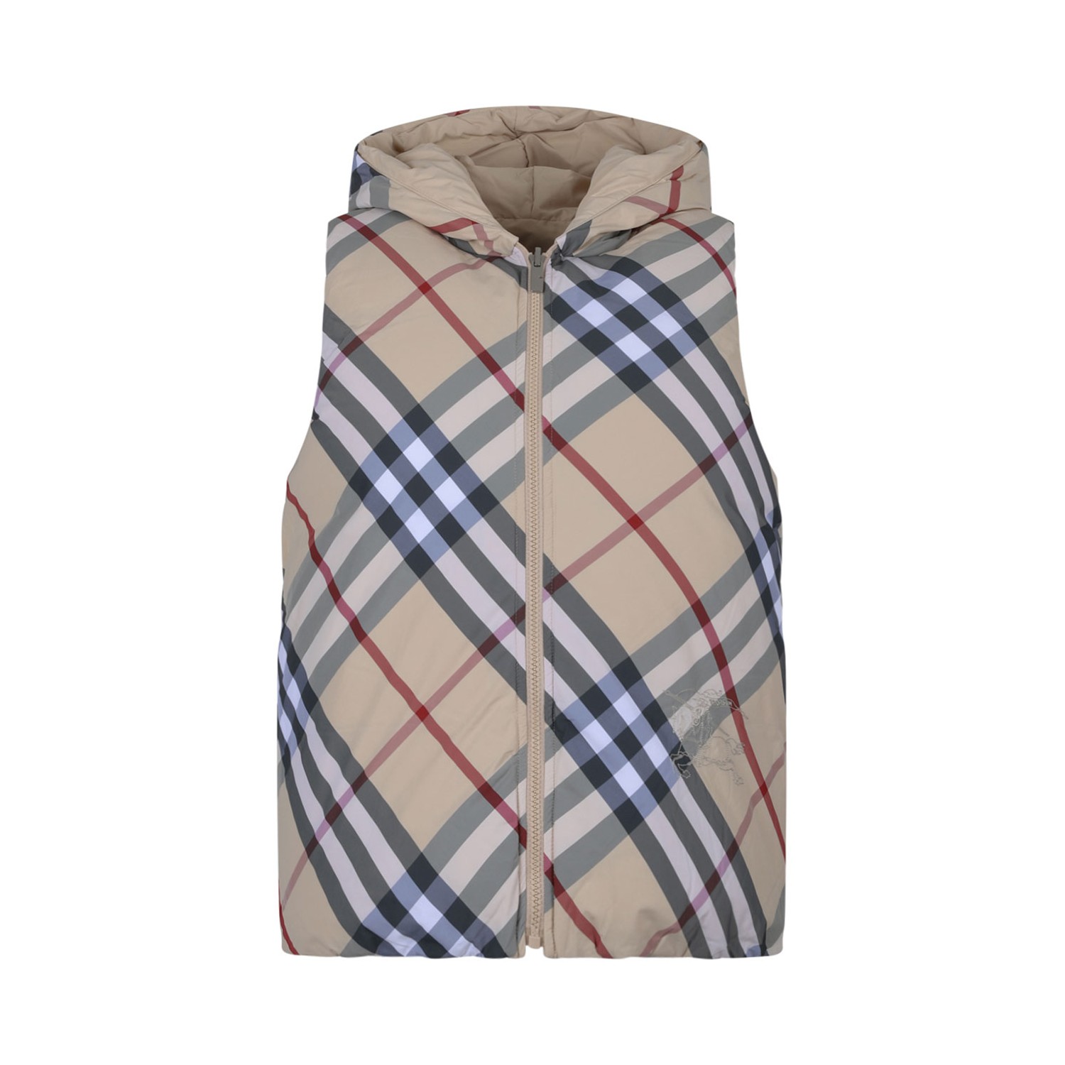 Burberry Kids Reversible Padded Gilet. Sand beige duck down nylon padded gilet, Vintage Check pattern, signature Equestrian Knight motif. Front zip fastening, reversible, slouchy hood, sleeveless.