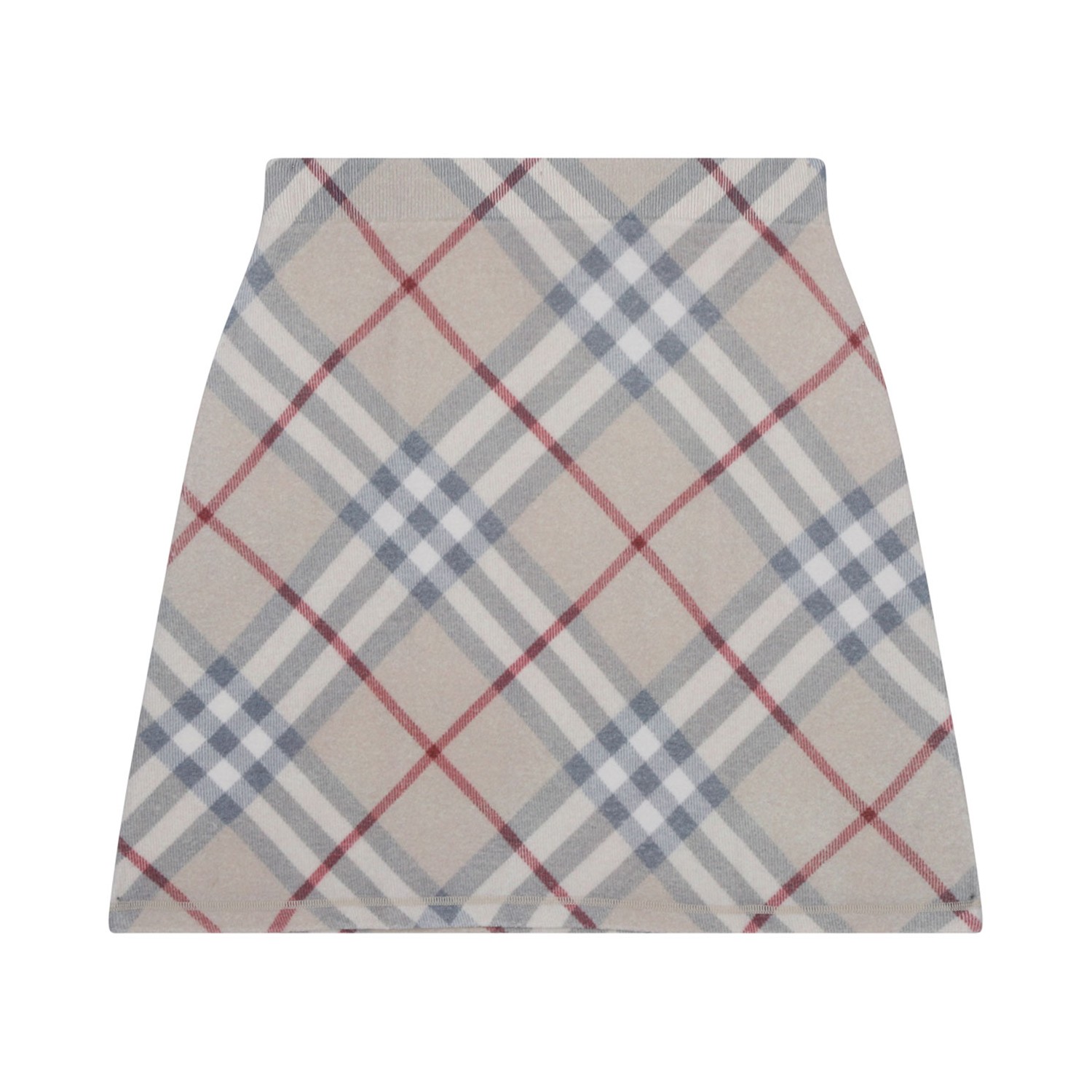 Burberry Kids Check Pattern Skirt. Ivory white, grey and red wool skirt, knitted construction, ribbed detailing. Check pattern, elasticated waistband, a-line, straight hem.