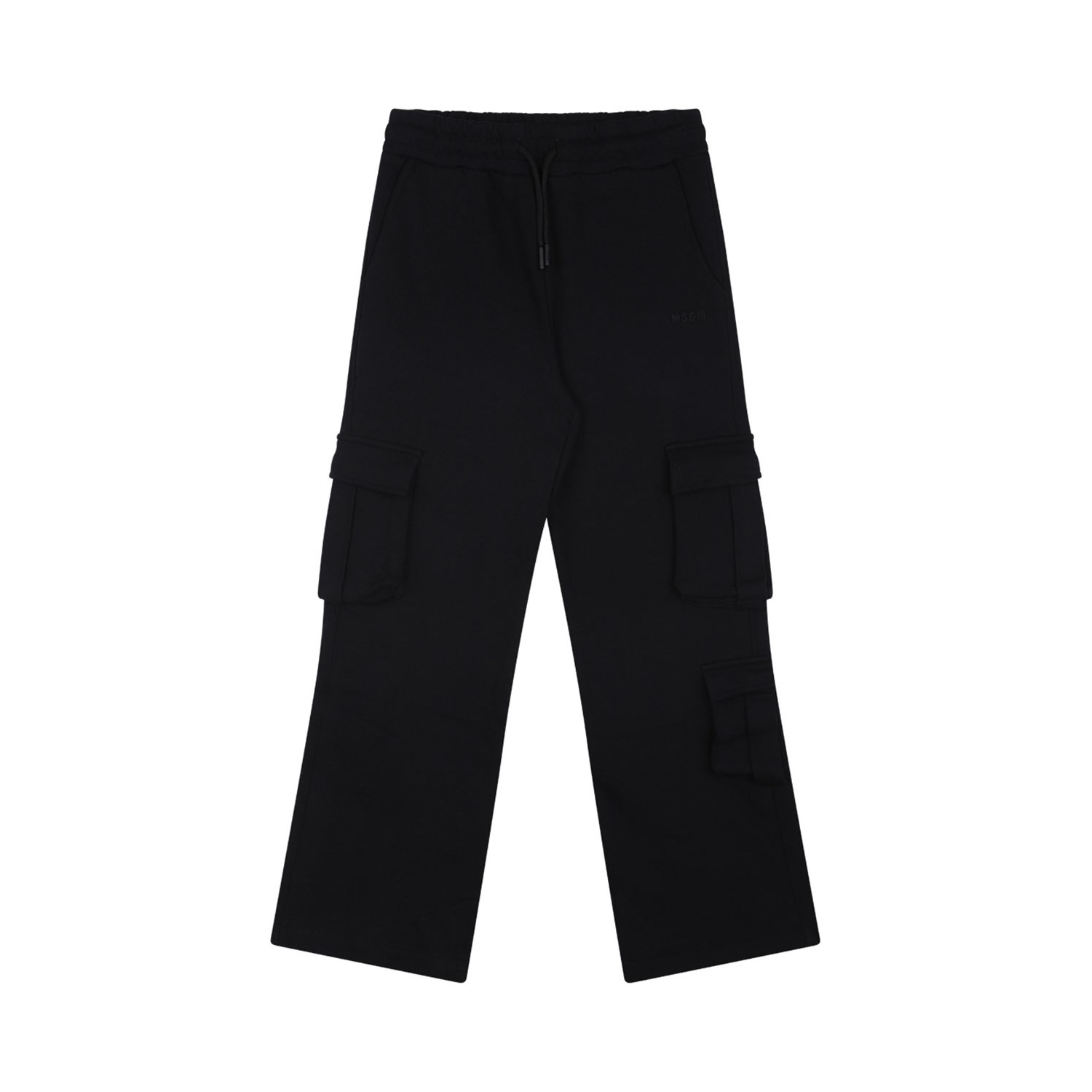 MSGM Kids Black Cargo Pants. Black cotton cargo pants, jersey texture, elasticated drawstring waistband, two diagonal pockets to the sides. Embroidered logo to the front, multiple cargo pockets, wide leg, fleece lining.