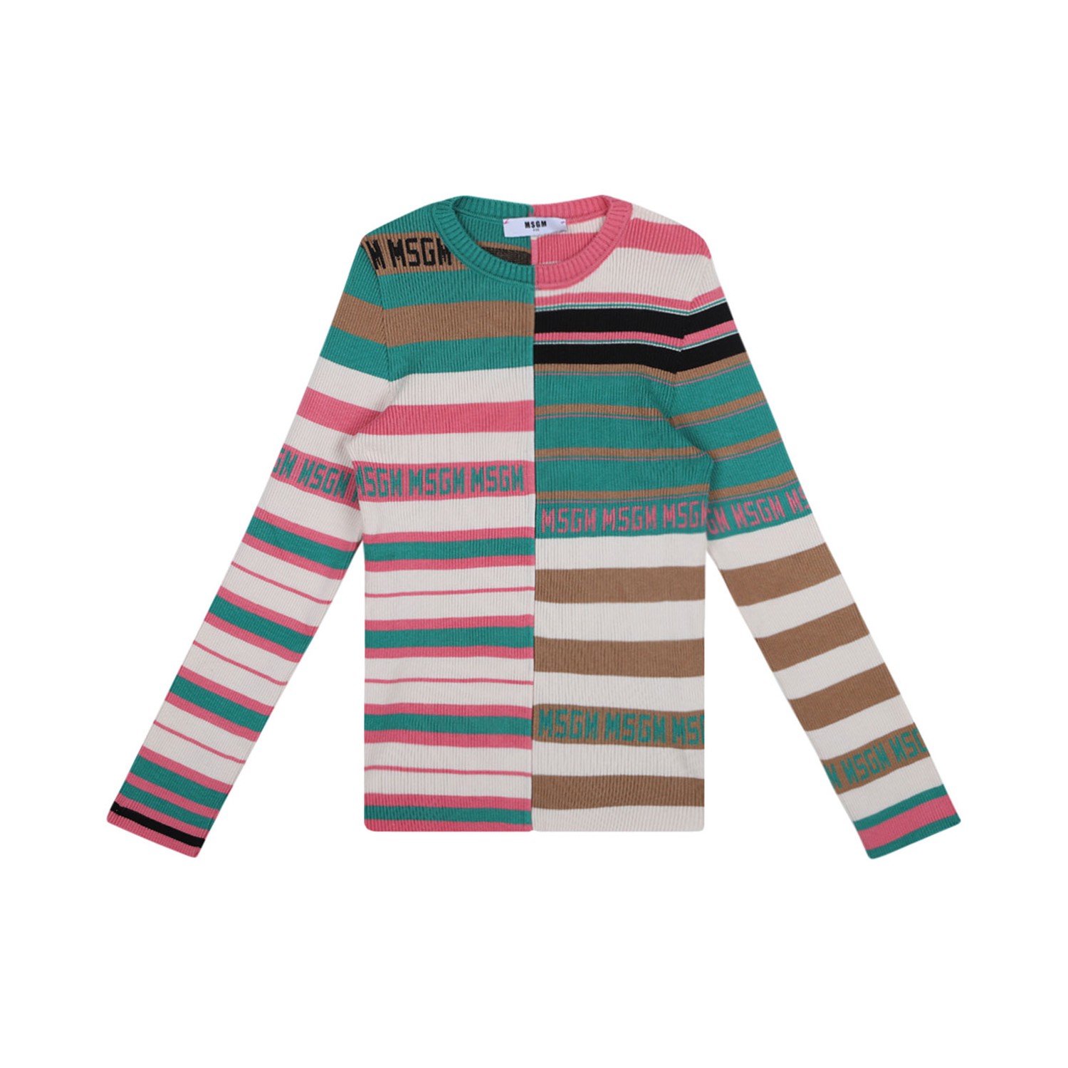 MSGM Kids Multricolour Striped Seater. Multicolour ribbed knit sweater, long sleeves, horizontal stripe pattern, cropped. Embroidered logo, internal logo patch.