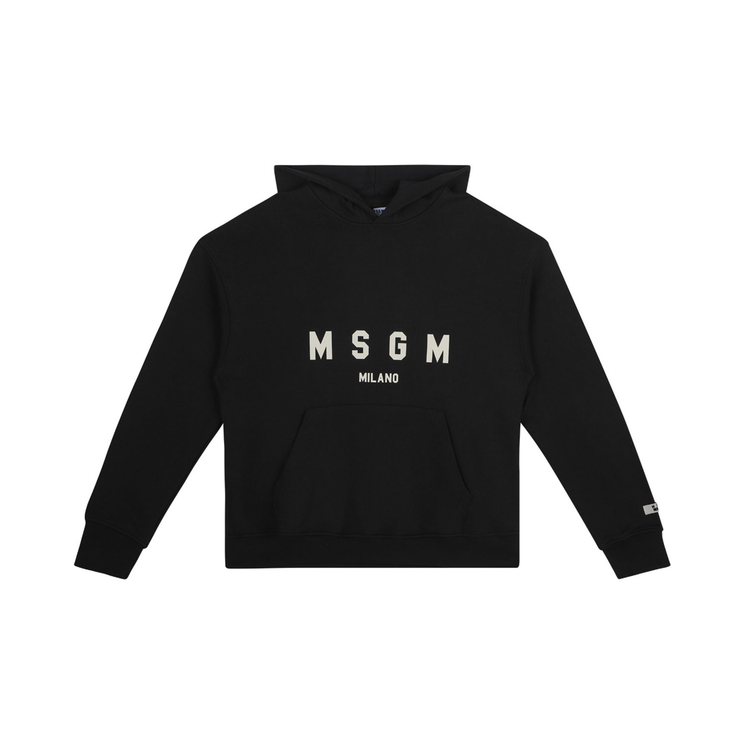 MSGM Kids Black Logo Print Hoodie. Black cotton hoodie, jersey texture, logo print to the front, logo patch at the sleeve. Drop shoulder, long sleeves, ribbed cuffs and hem, front pouch pocket, fleece lining.