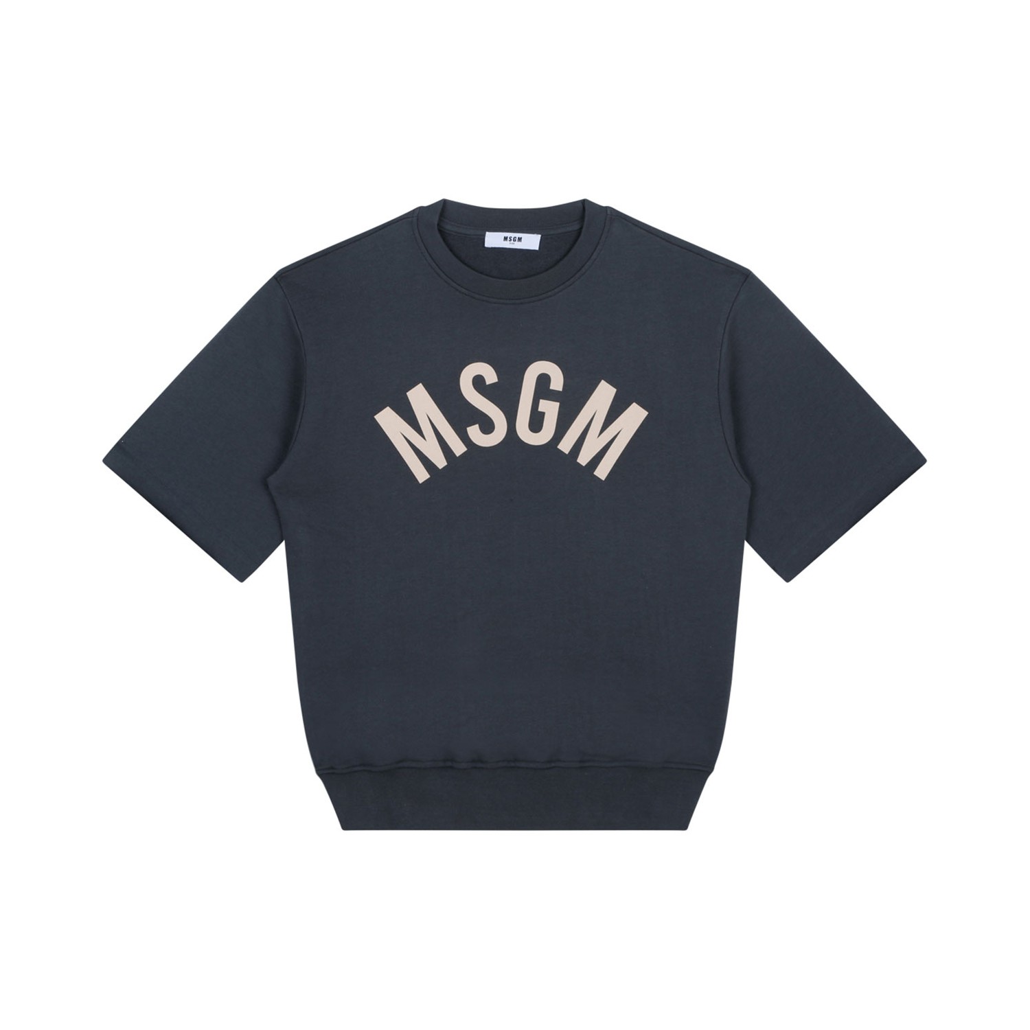 MSGM Kids Dark Grey Logo Print Sweatshirt. Dark grey cotton sweatshirt, jersey texture, logo print to the front, crew neck. Short sleeves, frayed edge, straight hem. Ribbed hem, French terry lining.