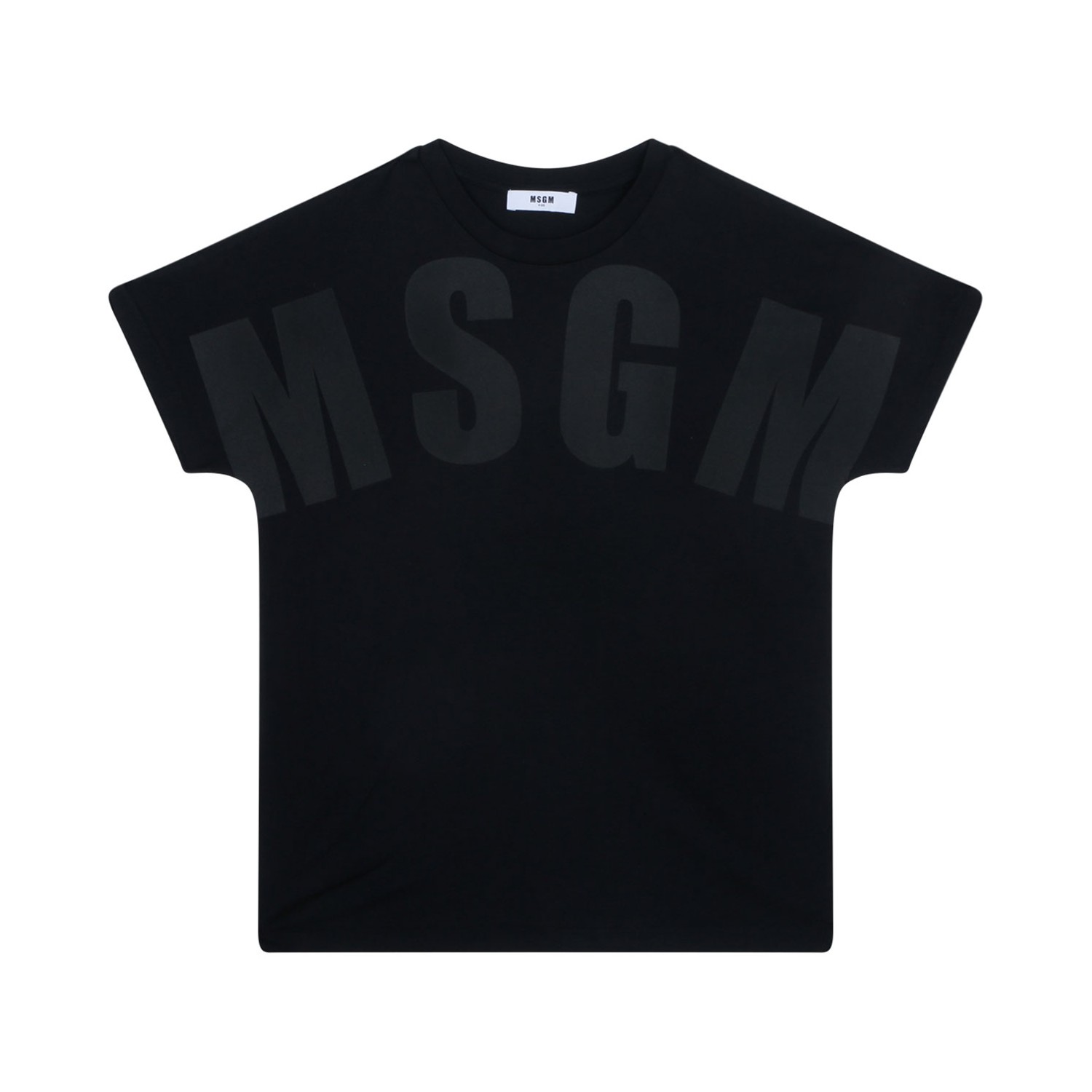 MSGM Kids Black Logo Print T-Shirt. Black cotton t-shirt, jersey texture, logo print to the front, crew neck, straight hem.
