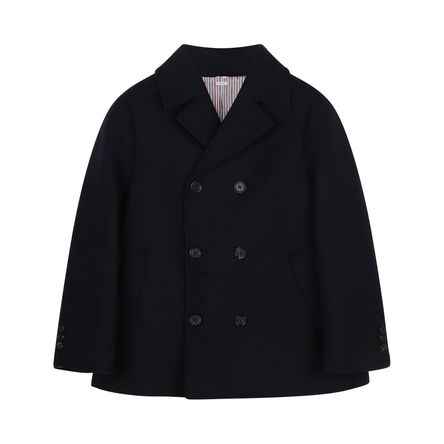 Thom Browne Kids Navy Blue Double Breasted Peacoat. Navy blue wool peacoat, RWB stripe, notched lapels. Double-breasted button fastening, long sleeves, slip pockets to the sides.