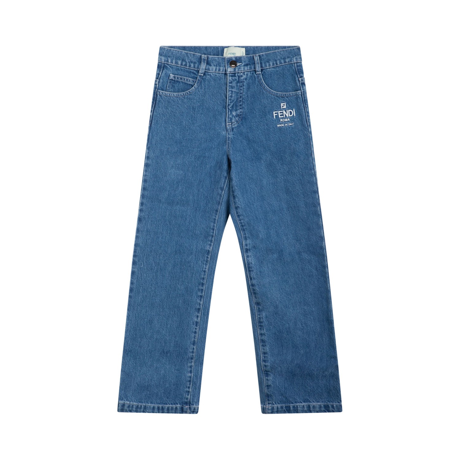 Fendi Kids Wash Denim Trousers. Medium wash denim with regular fit and chalk-coloured FF Fendi Roma thread embroidery on the front under the pocket.