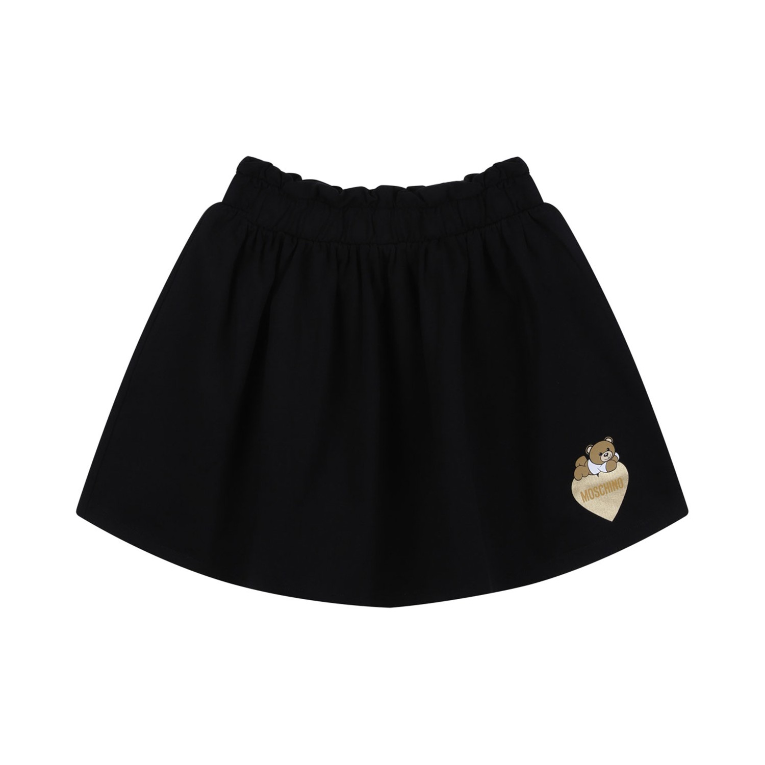 Moschino Kids Black Logo Print Skirt. Black cotton blend skirt, stretch jersey, logo print to the side, high rise. Flared design, elasticated waistband, thigh length, curved hem.