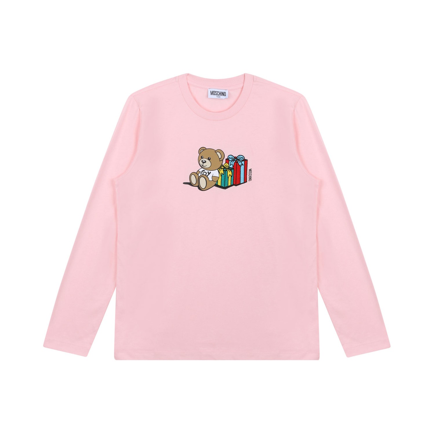Moschino Kids Pink Graphic Print T-Shirt. Pink cotton t-shirt, crew neck, graphic print to the front, long sleeves, straight hem.