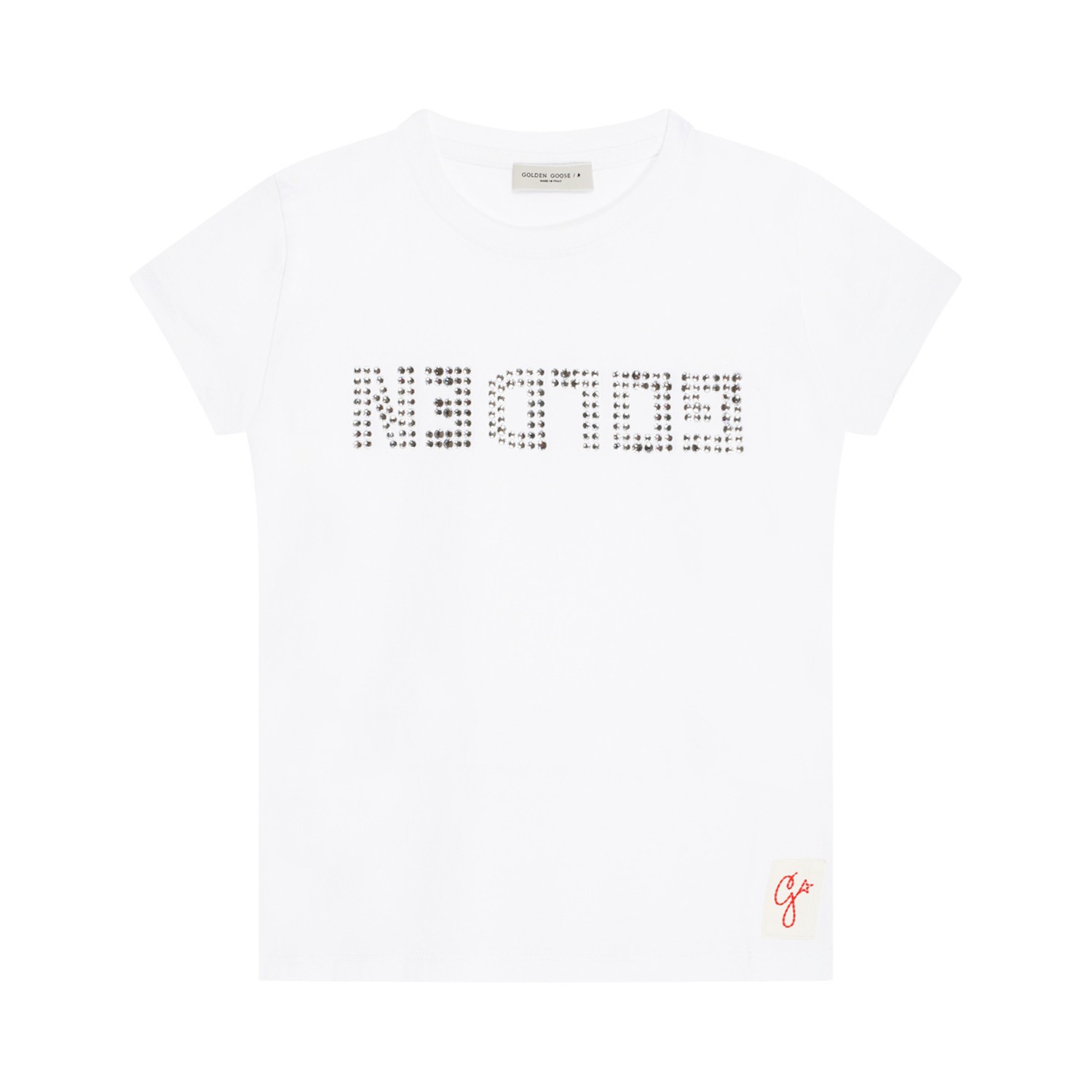 Golden Goose Kids Optic White Cotton Rhinestone Embellished T-Shirt. Optic white cotton t-shirt, rhinestone logo embellishment, short sleeves, round neck, straight hem.