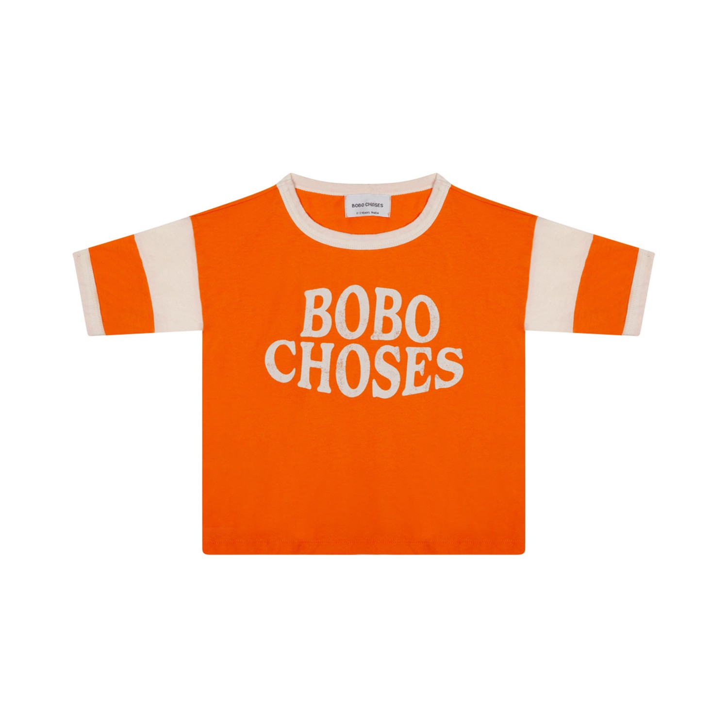 Bobo Choses Logo Print T-Shirt. Pumpkin orange and white organic cotton t-shirt, lightweight jersey, logo print to the front. Stripe detailing, contrasting trim, crew neck, drop shoulder, short sleeves, straight hem.