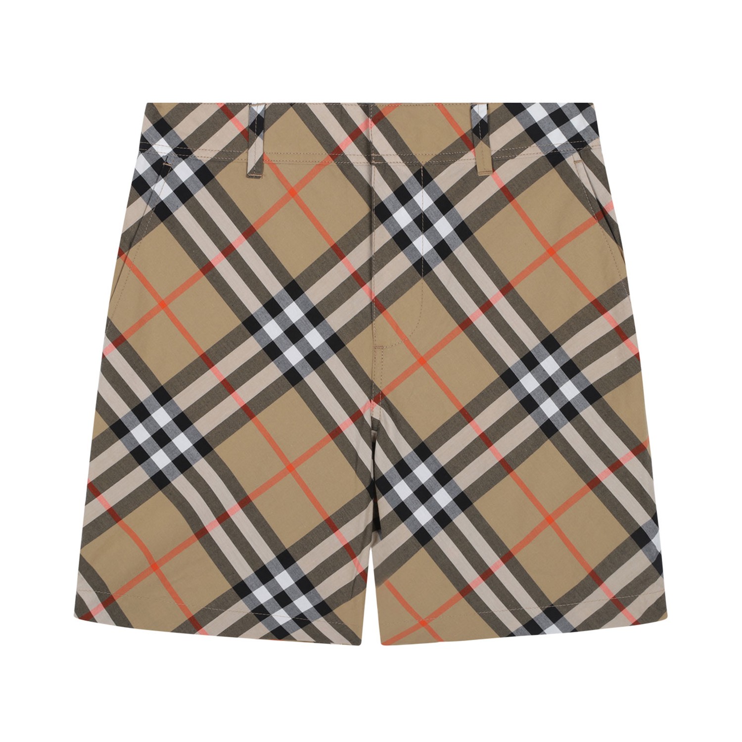 Burberry Kids Vintage Check Shorts. Archive beige and multicolour cotton shorts, twill weave, Vintage Check pattern. Belt loops, above-knee length, concealed front fastening. Slip pockets to the sides and rear flap pocket.