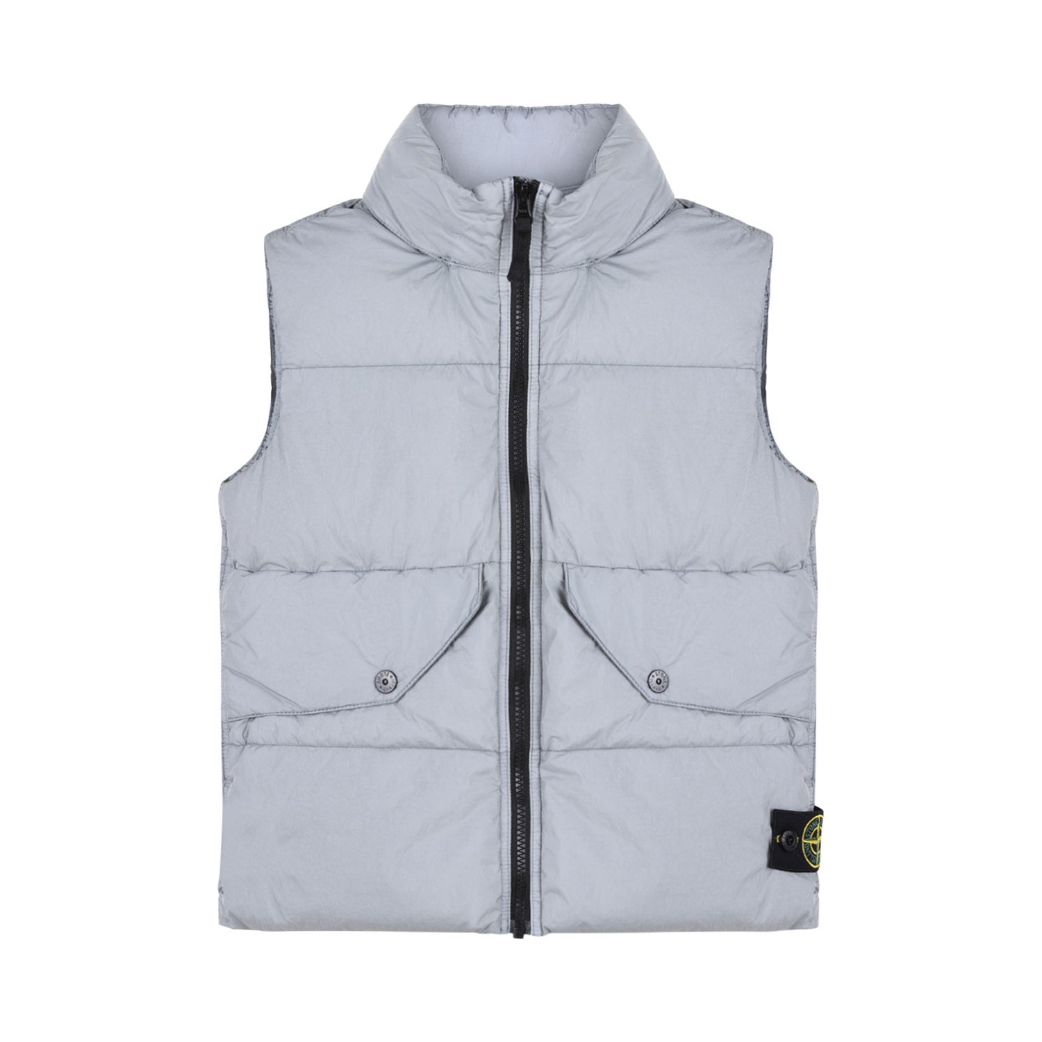 Stone Island Junior Dust Compass Badge Gilet. Dust gilet with front zip fastening, stand-up collar, two press-stud fastening side pockets and straight hem.