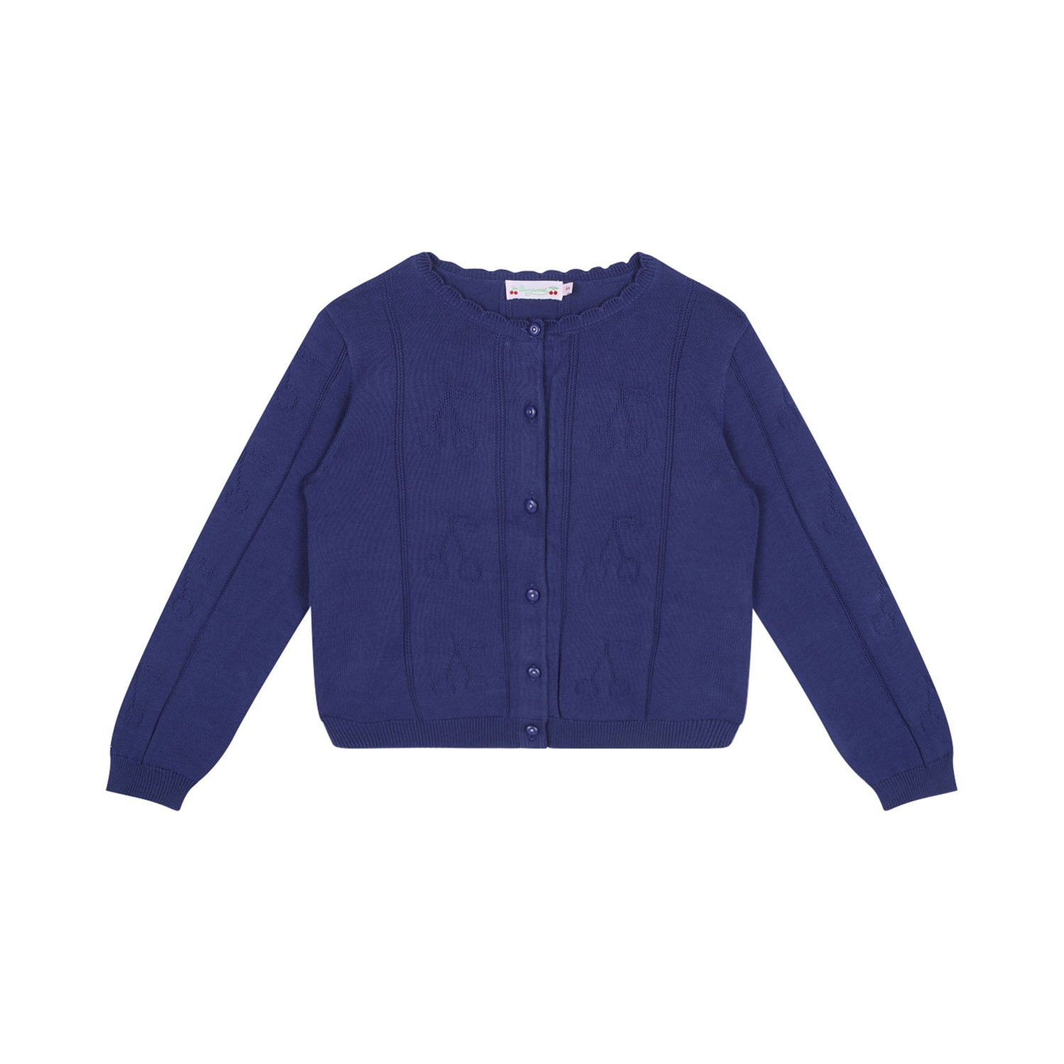 Bonpoint Eliona Cardigan. Indigo blue cotton cardigan, front button fastening, embroidered design, long sleeves.