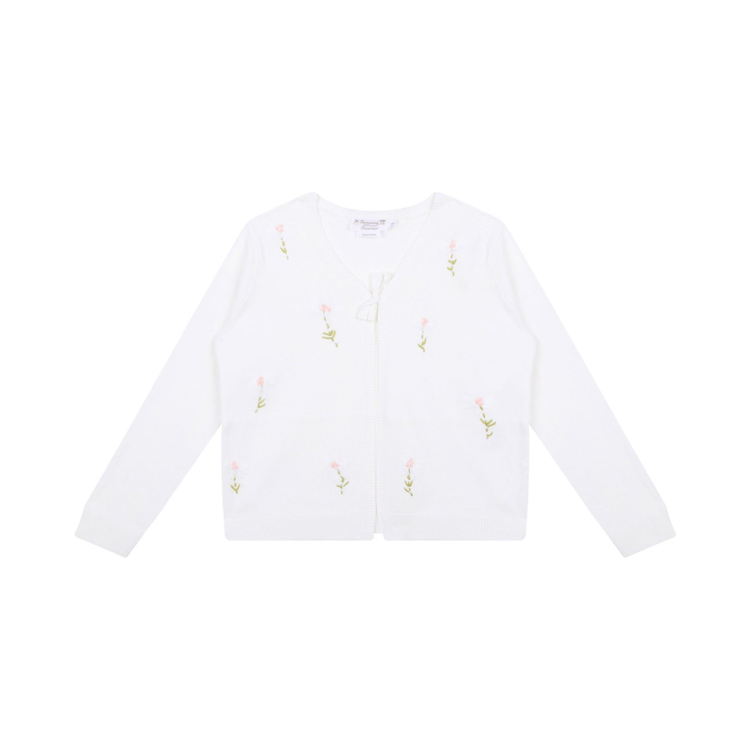 Bonpoint Esmia Cardigan. White cotton cardigan with floral embroidery, open front, long sleeves.
