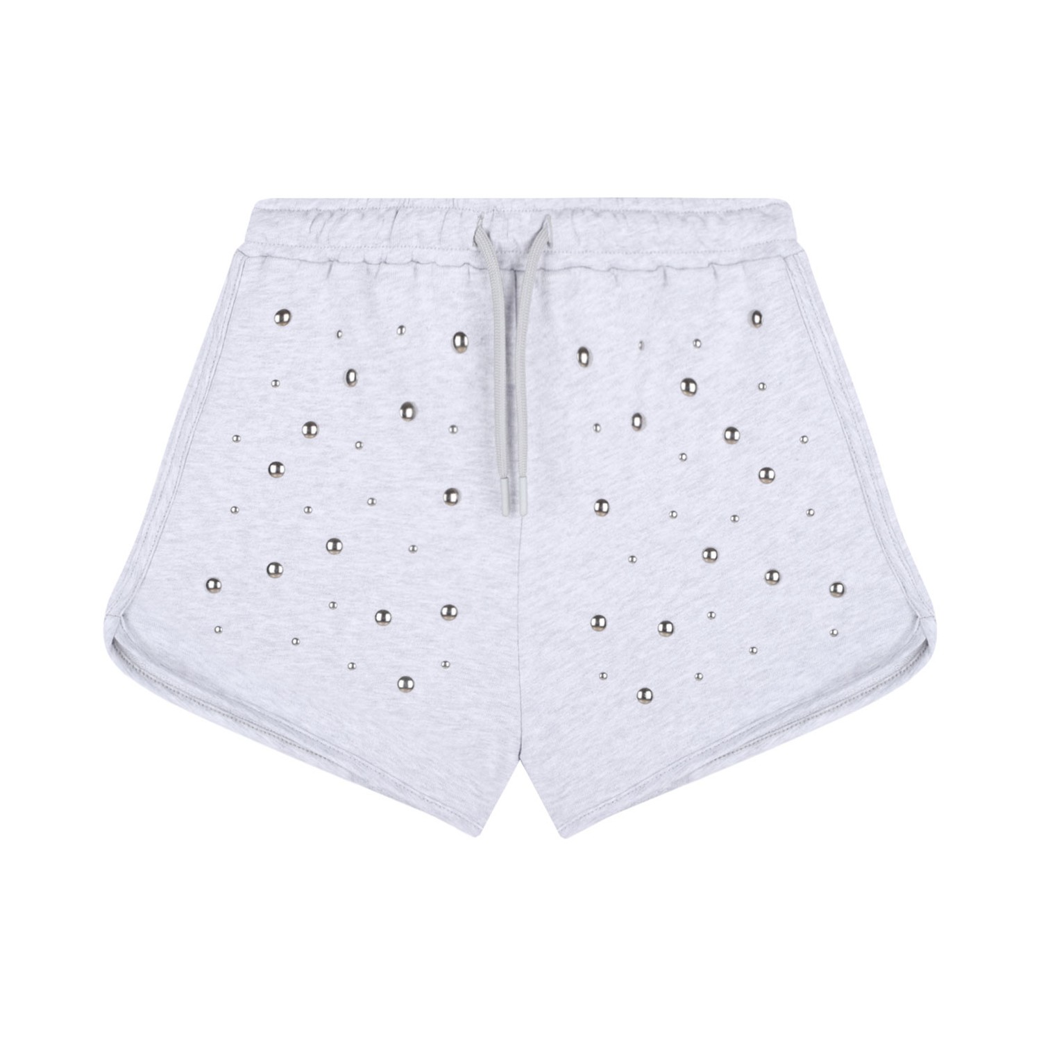 MSGM Kids Heather Grey Studded Shorts. Heather grey cotton shorts with studded, elasticated drawstring waistband, embroidered logo to the rear, melange effect, curved hem.