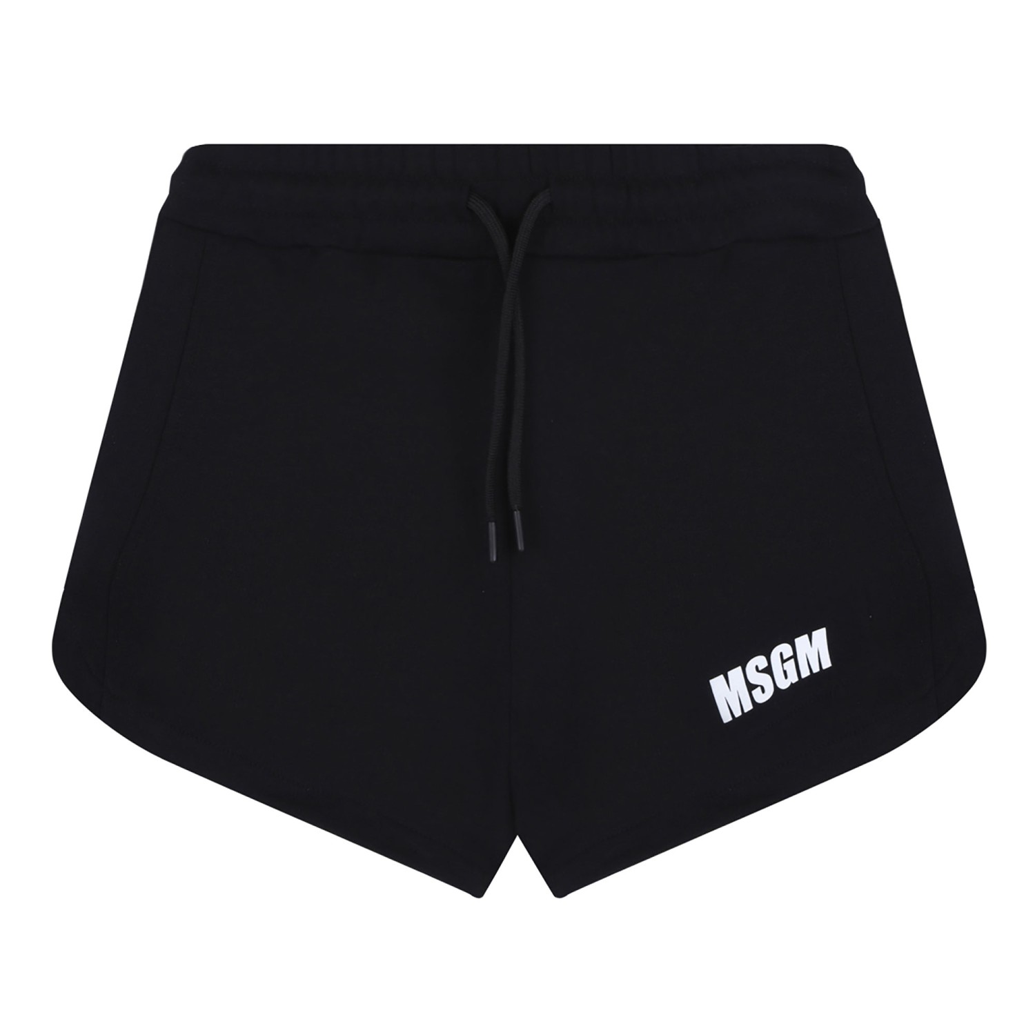 MSGM Kids Black Logo Print Shorts. Black cotton shorts with logo print at the leg, elasticated drawstring waistband.