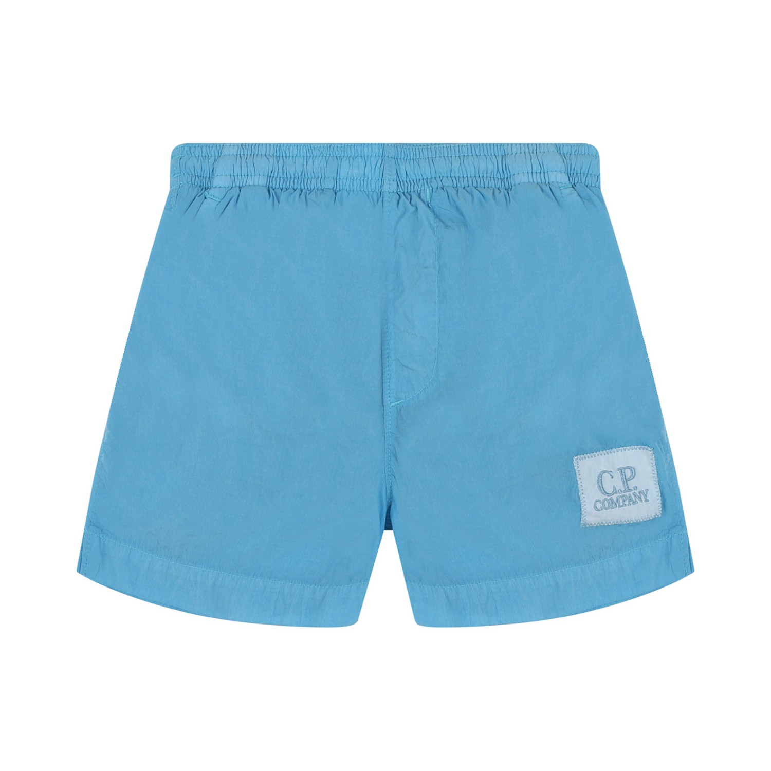 C.P. Company Kids Light Blue Swimshorts. Light blue swimshorts, front logo patch down, elastic waistband.