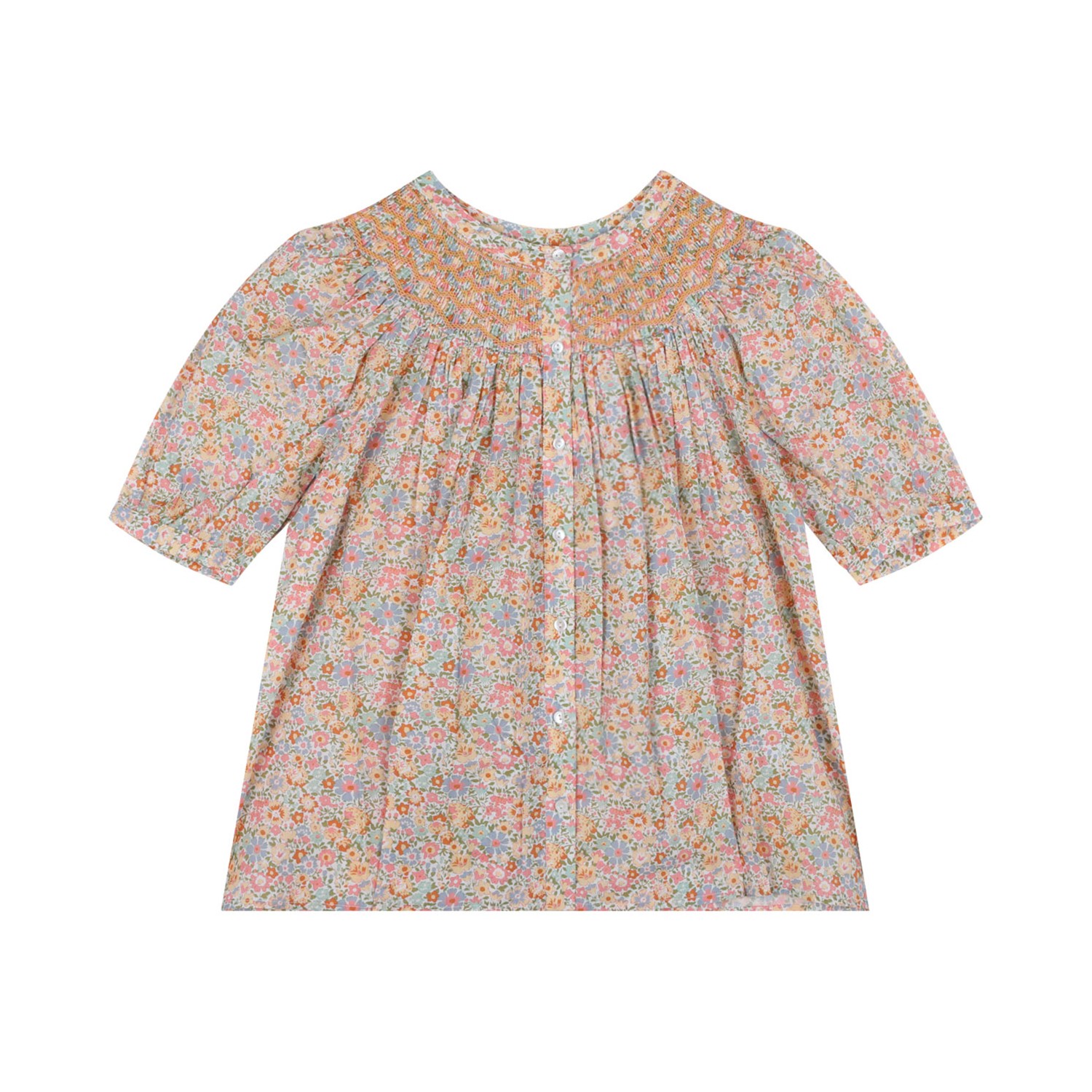 Bonpoint Elouane Blouse. Orange cotton blouse with all-over floral print, front button fastening, short sleeves.