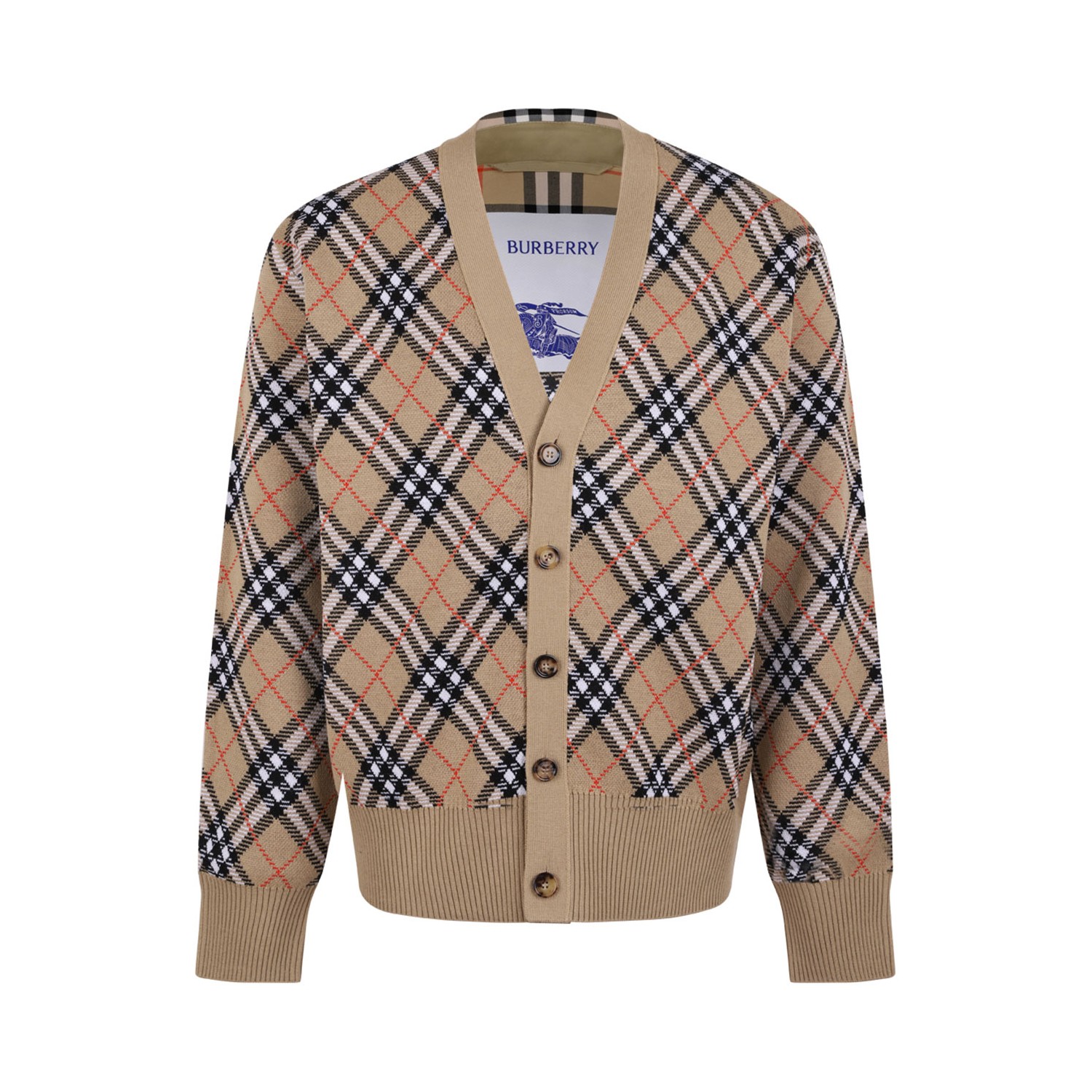 Burberry Beige Cardigan George. George wool cardigan with its classic cut featuring a V-shaped neckline and long sleeves finished with elegant ribbed cuffs. Symmetrical argyle pattern