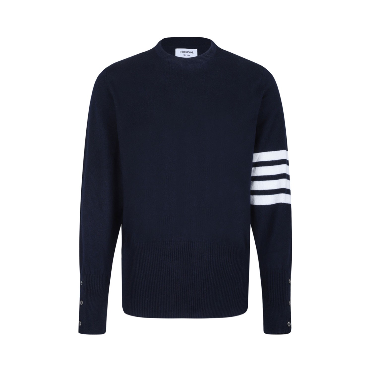 Thom Browne Navy Blue 4-Bar Pullover. Navy blue cashmere pullover, crew neck, 4-Bar signature to the sleeve, long sleeves.