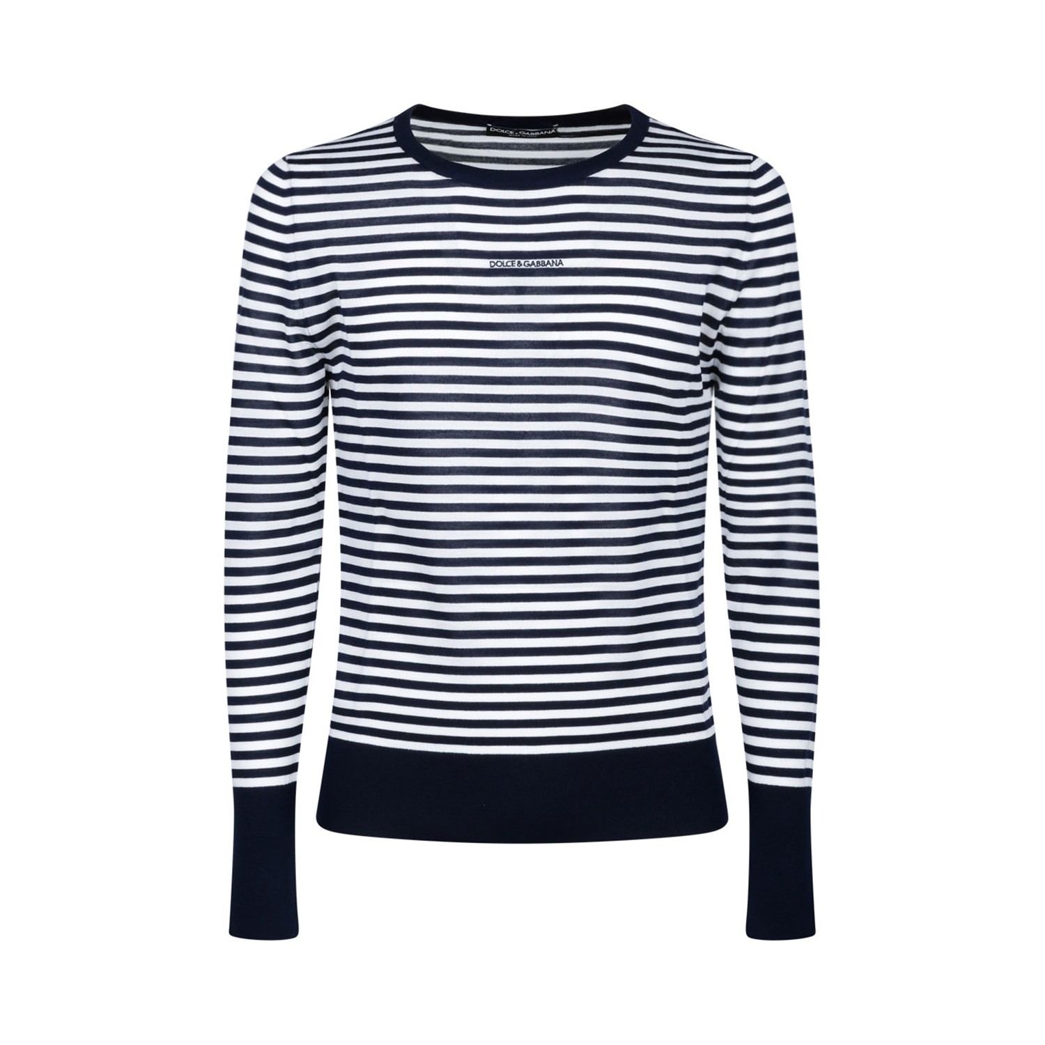 Dolce & Gabbana Blue and White Boat Neck Sweater. Blue and white virgin wool sweater, striped, logo embroidery. Long sleeves, fine rib sleeve trim and neck.